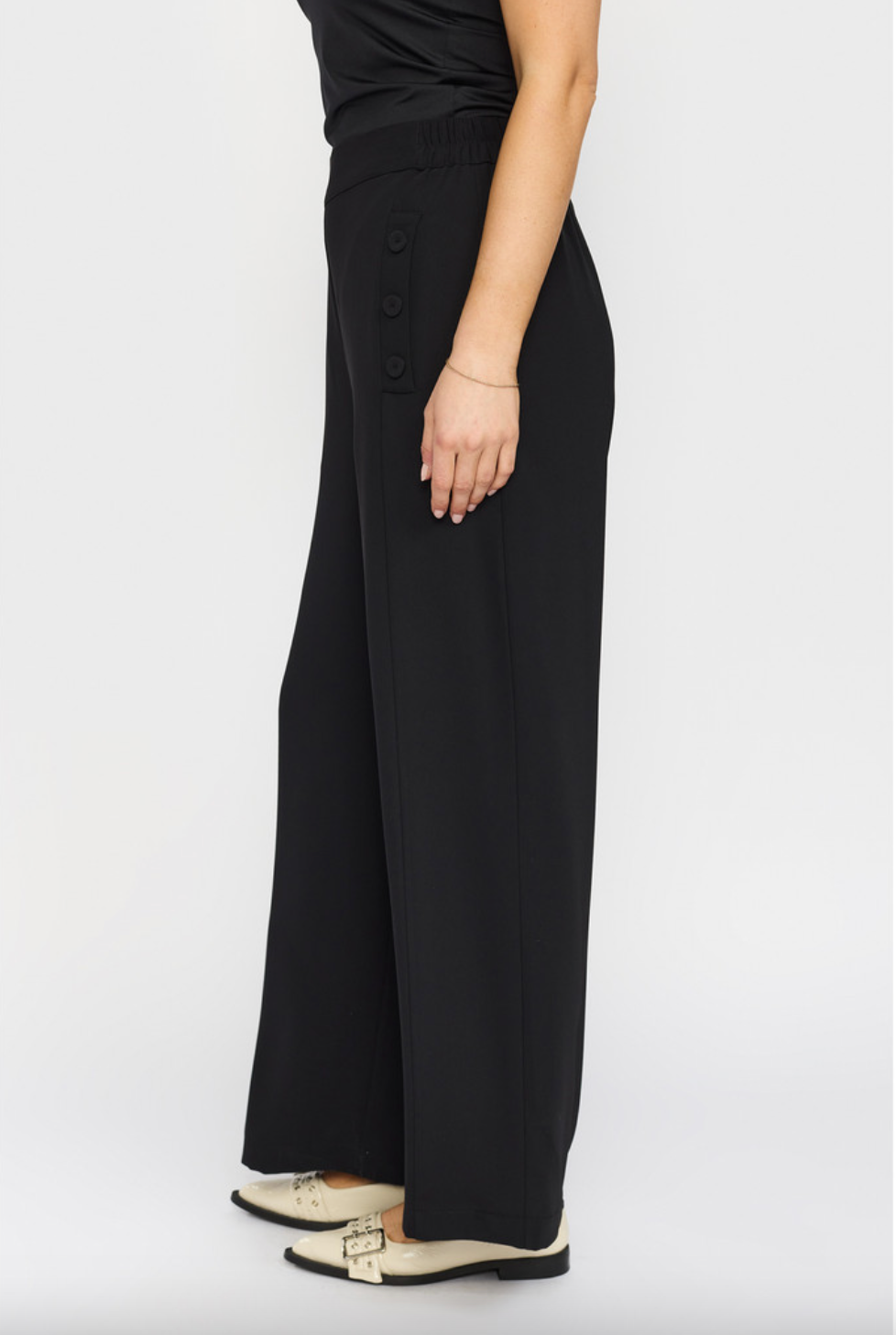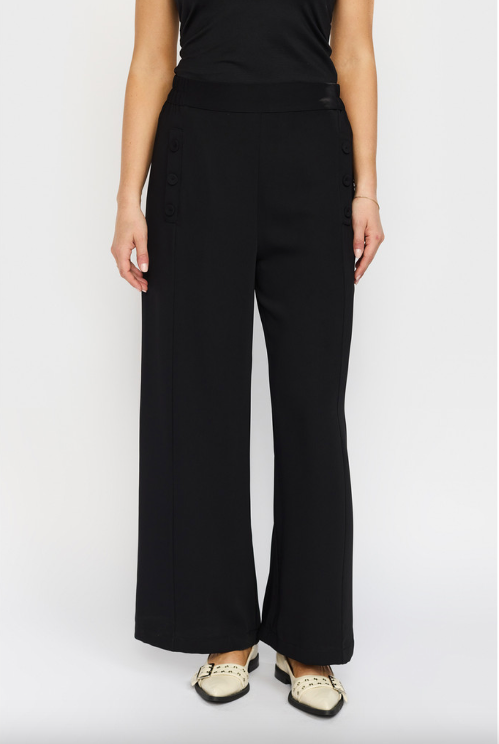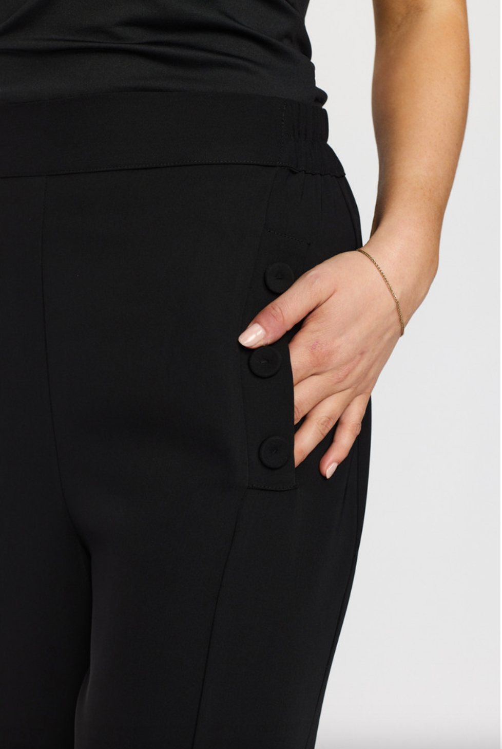 Stilren dressbukse med rette ben og strikk i livet bak. Knappdetaljer på lommene.
