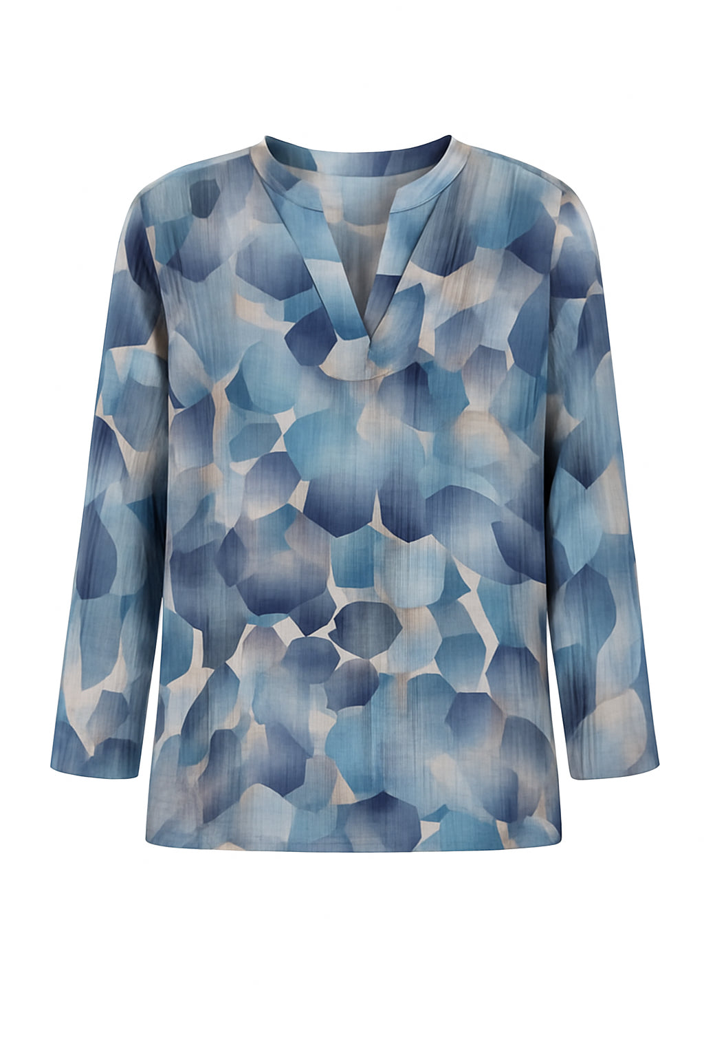 VAMOA-blusen i fargen Blue Cell kombinerer stil og komfort med sitt elegante V-halsdesign og trekvartlange ermer. Laget av en bærekraftig blanding av økoviskose og polyamid, gir denne blusen en myk og behagelig følelse mot huden.