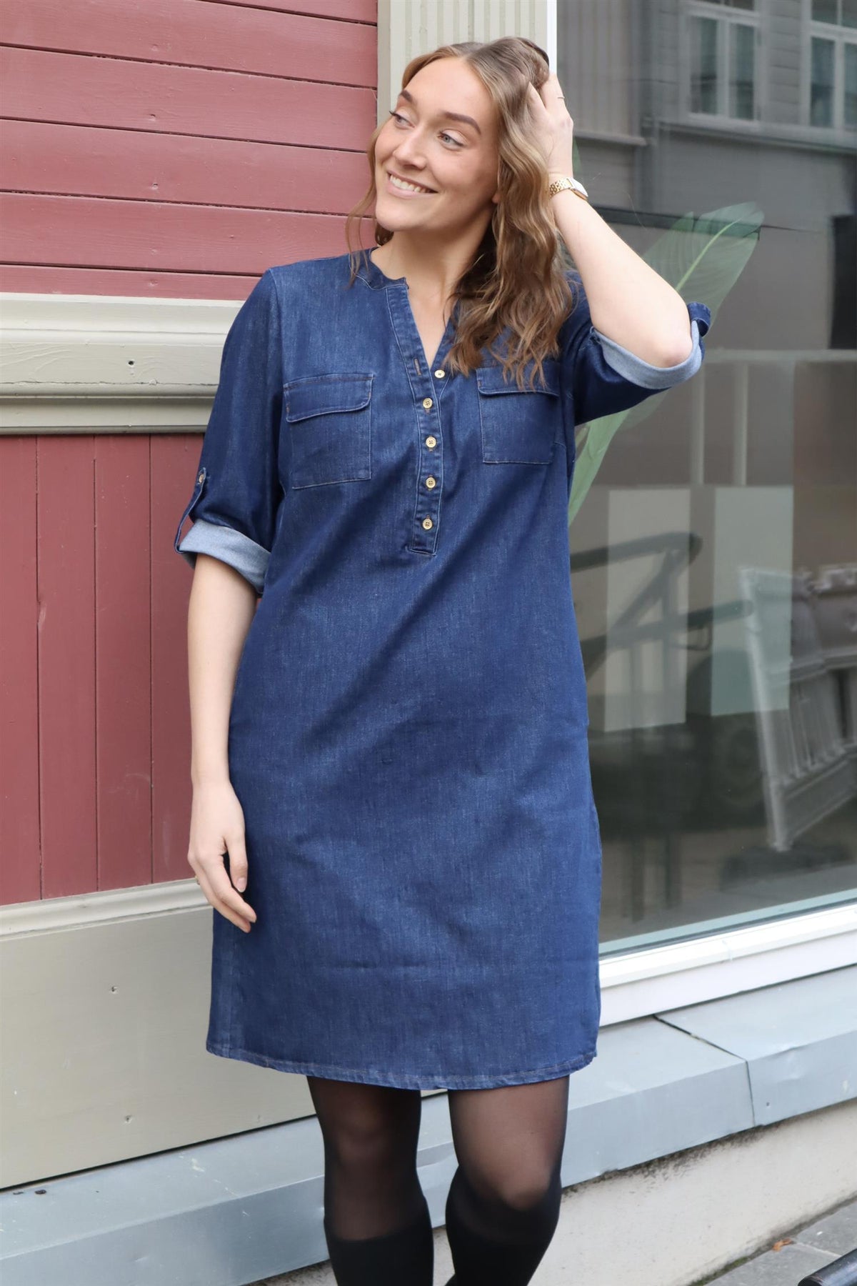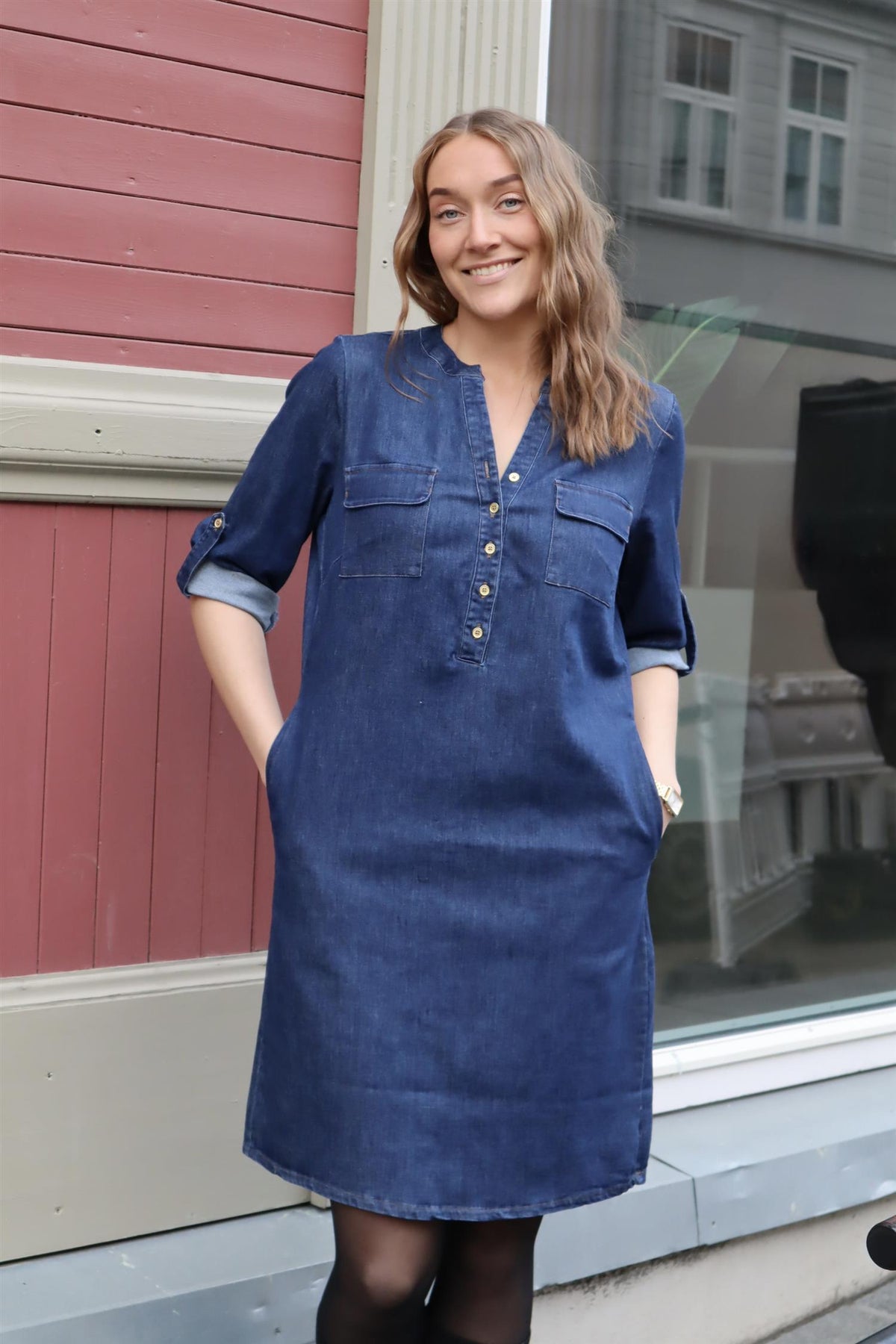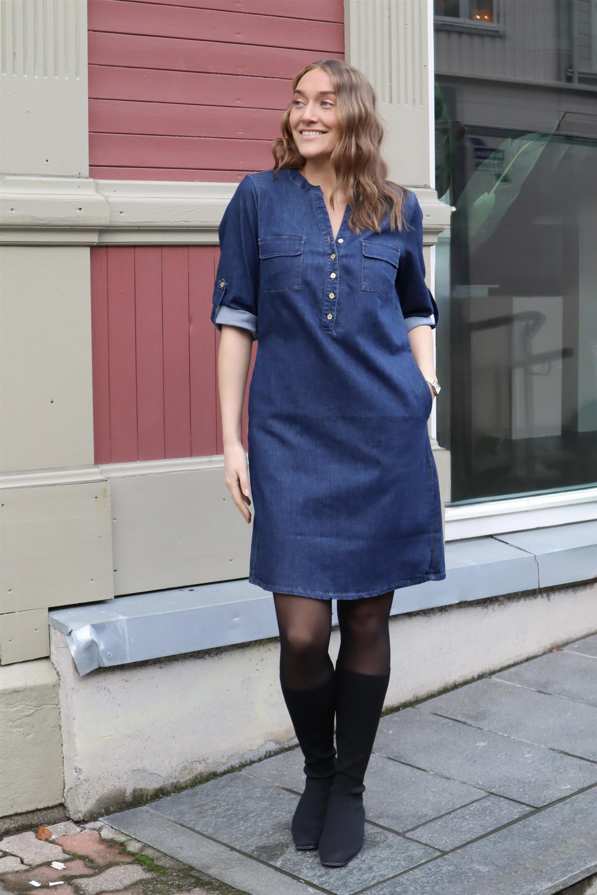 Bestselgermodellen Ella er nå kommet i denim! Kjolen har deilig stretch og lommer.