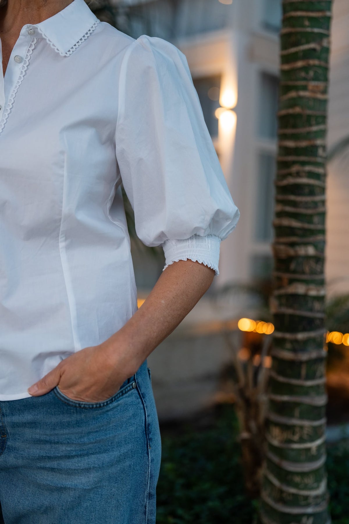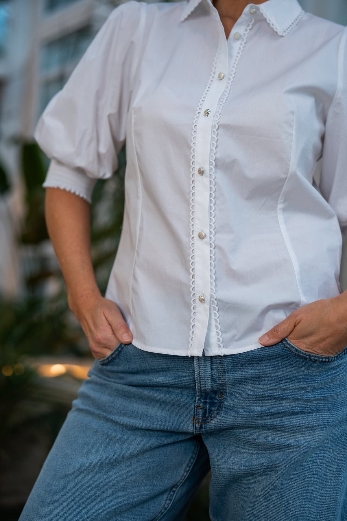 Lekker bluse fra Karen By Simonsen. Blusen har et feminint snitt med lekre knapper, pufferm og strikk på ermene.