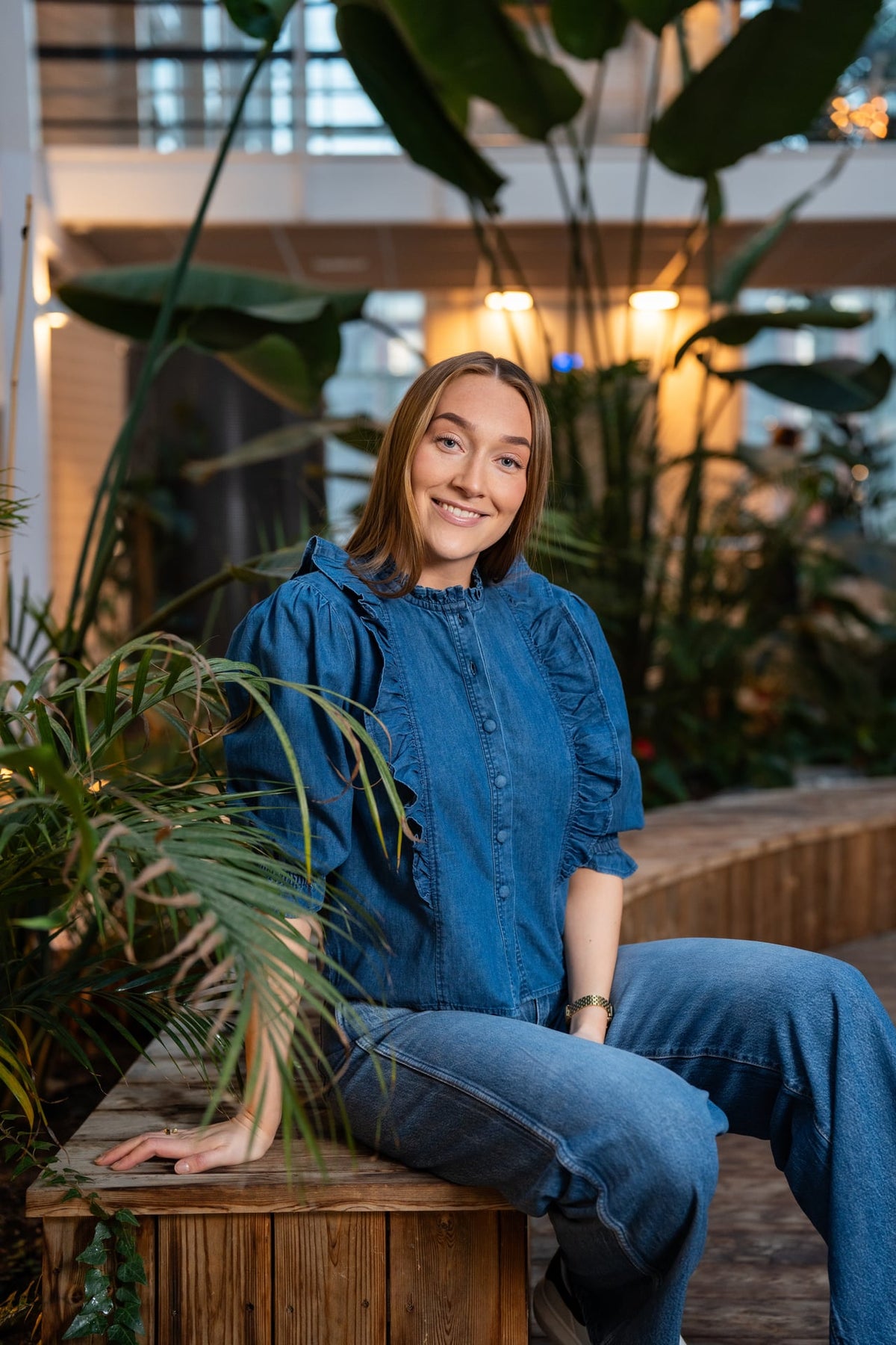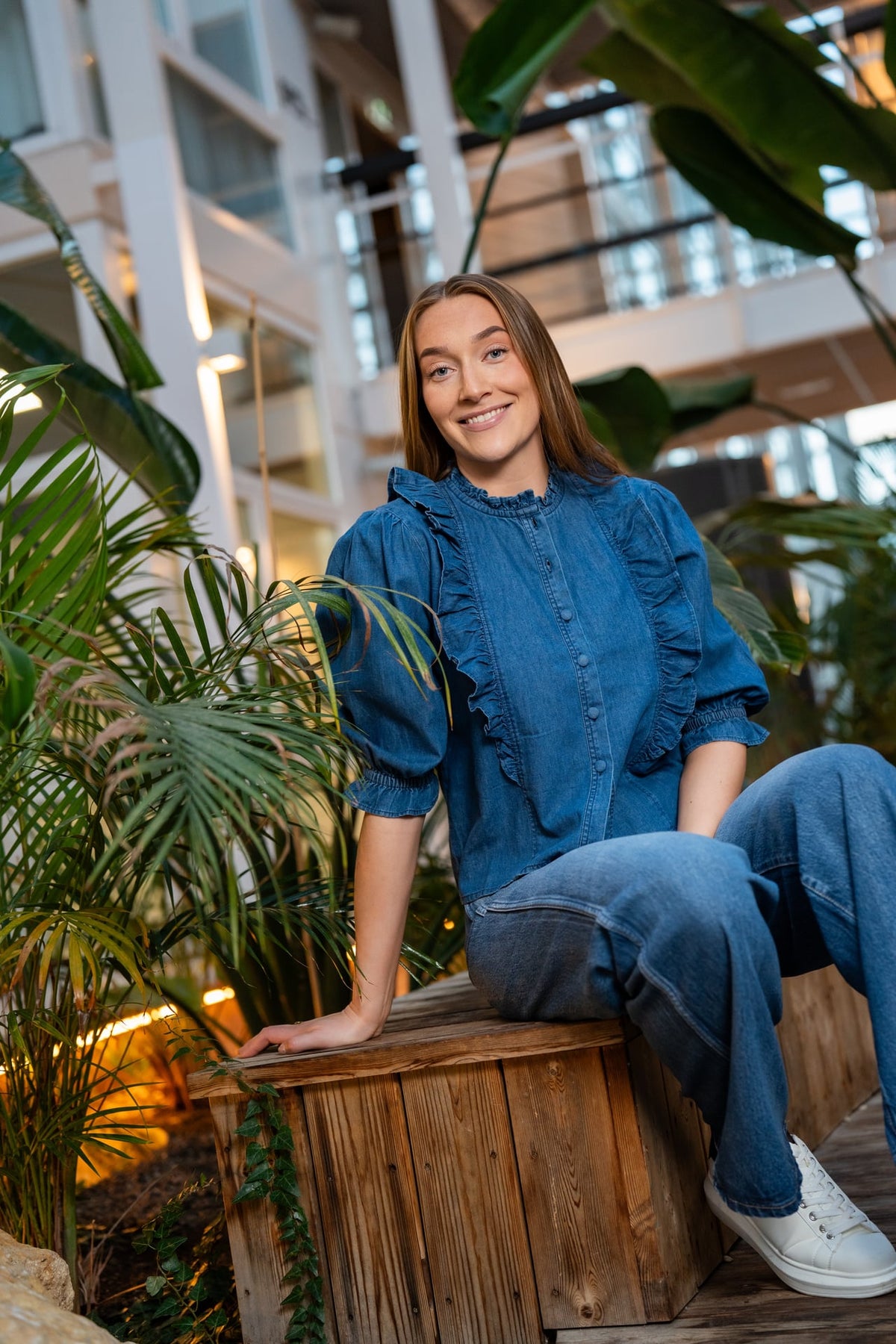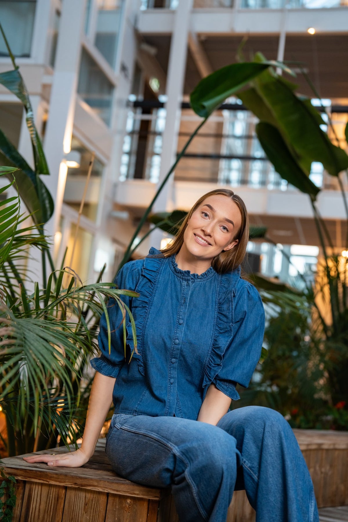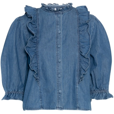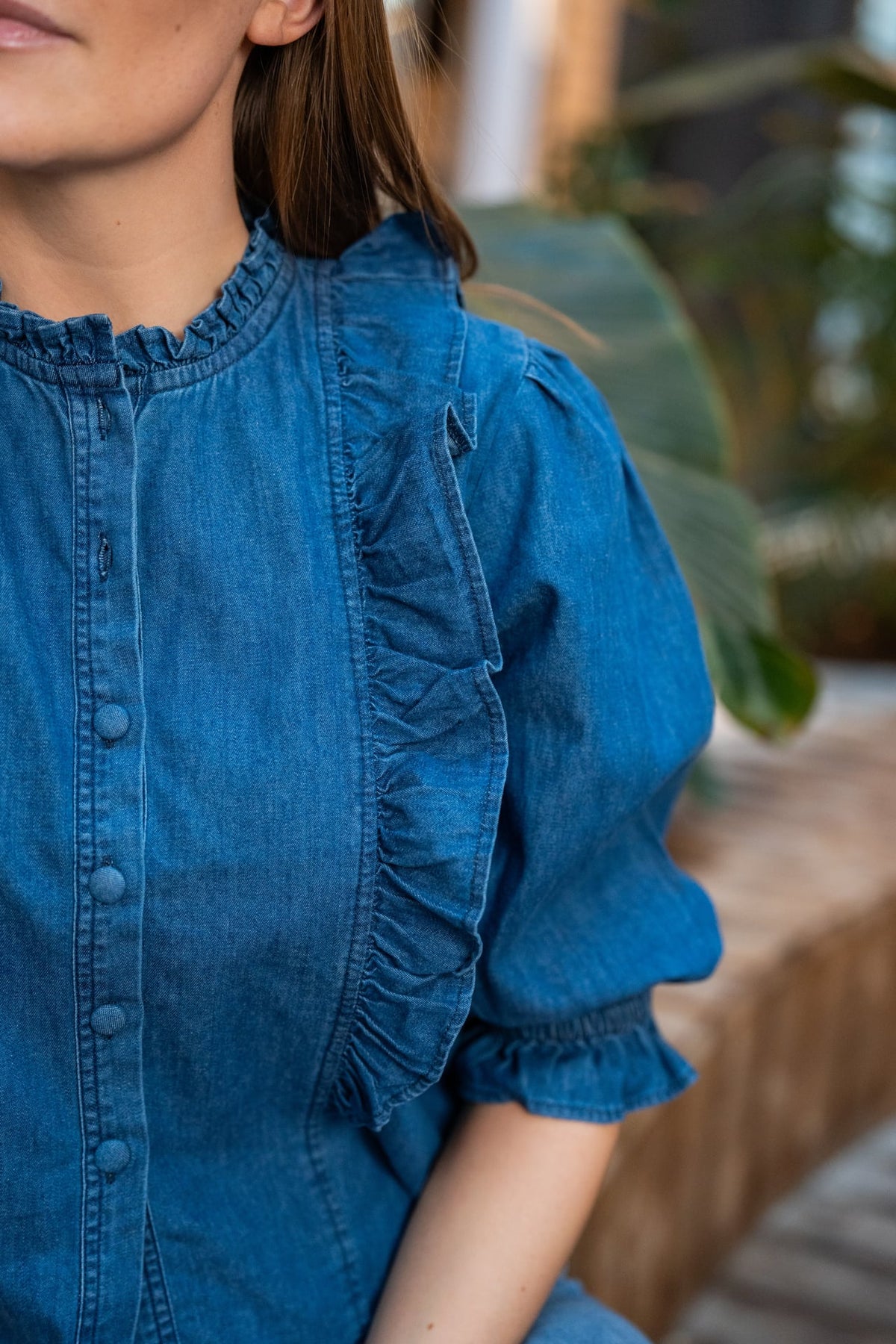 Denimtop fra norske RAH Oslo. Skjorten har knepping hele veien ned, søte rysjedetaljer over skuldrene, og halv arm med strikk på ermene.