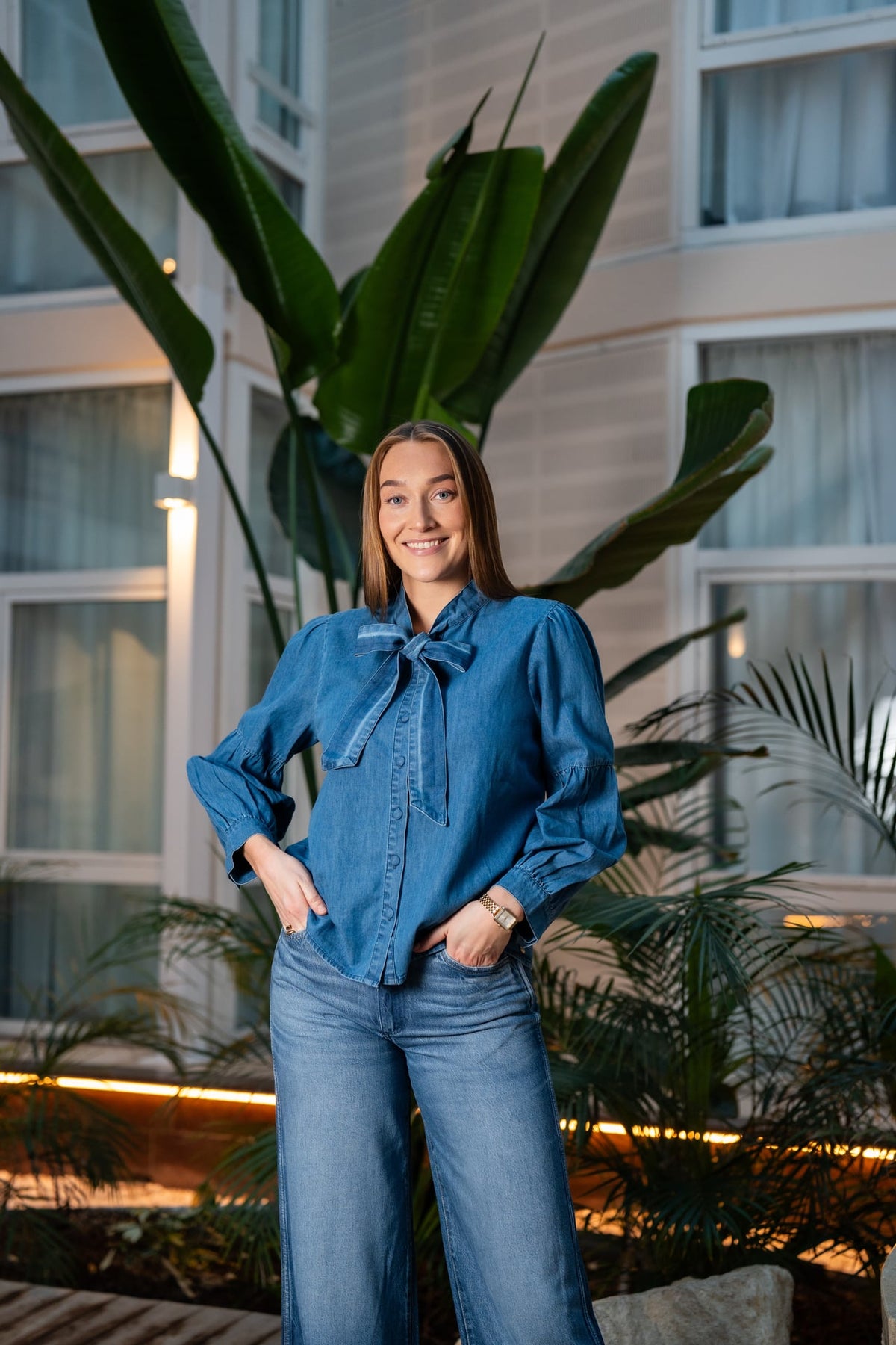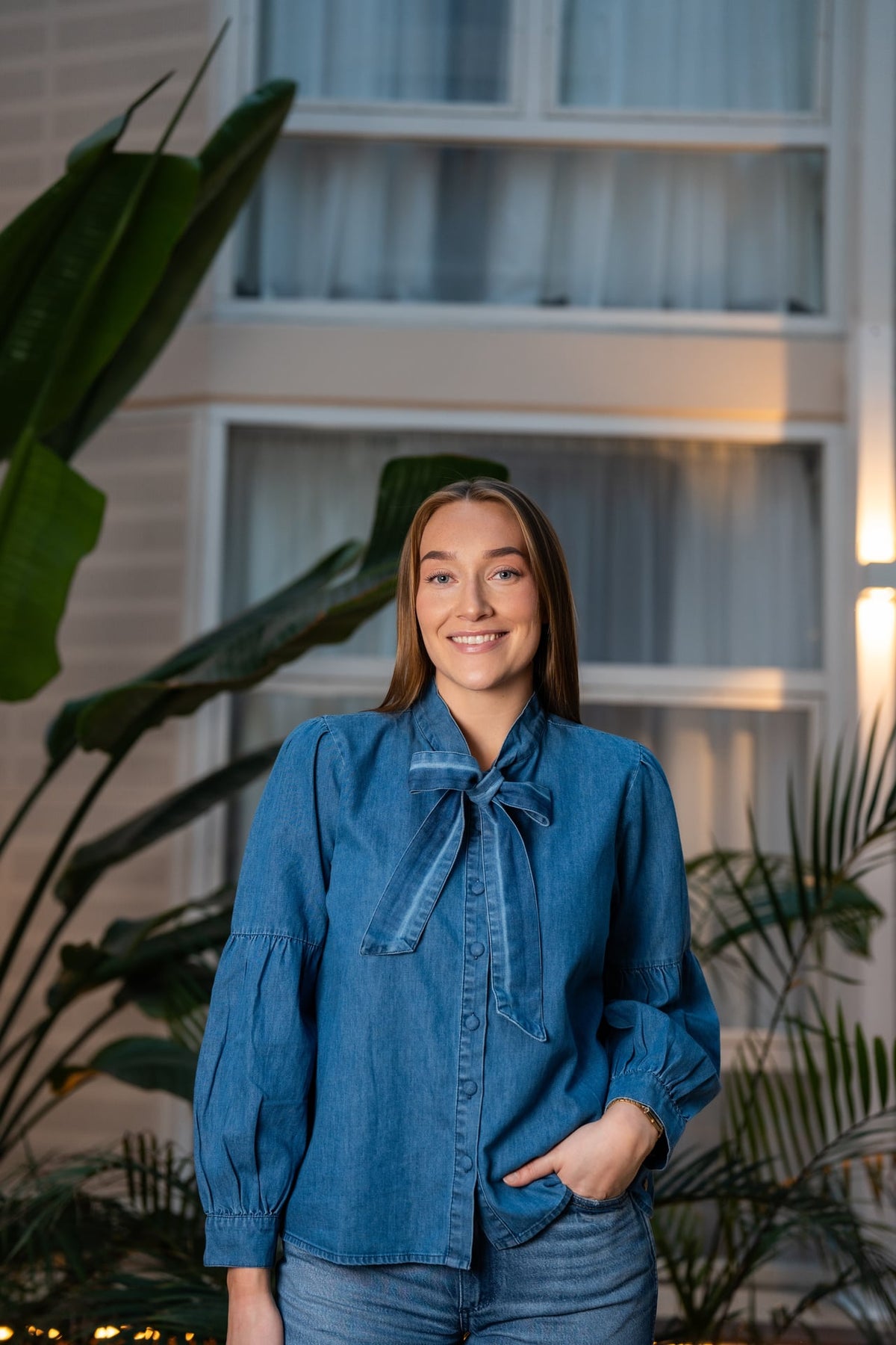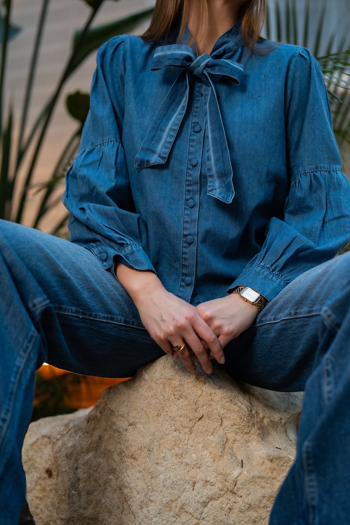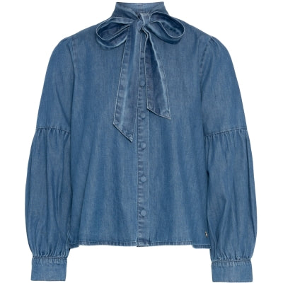 Superfin denimbluse fra norske RAH Oslo. Blusen har knepping hele veien ned og lange armer med sømdetalj. Påsydd bånd i kragen som kan kan knytes og styles på mange måter.