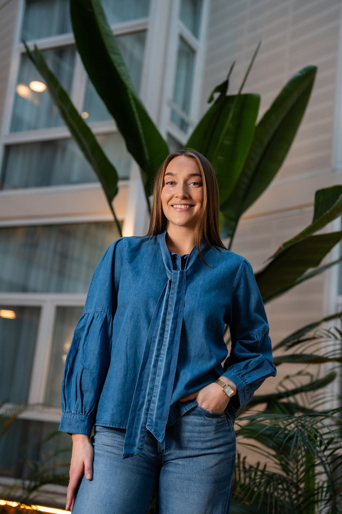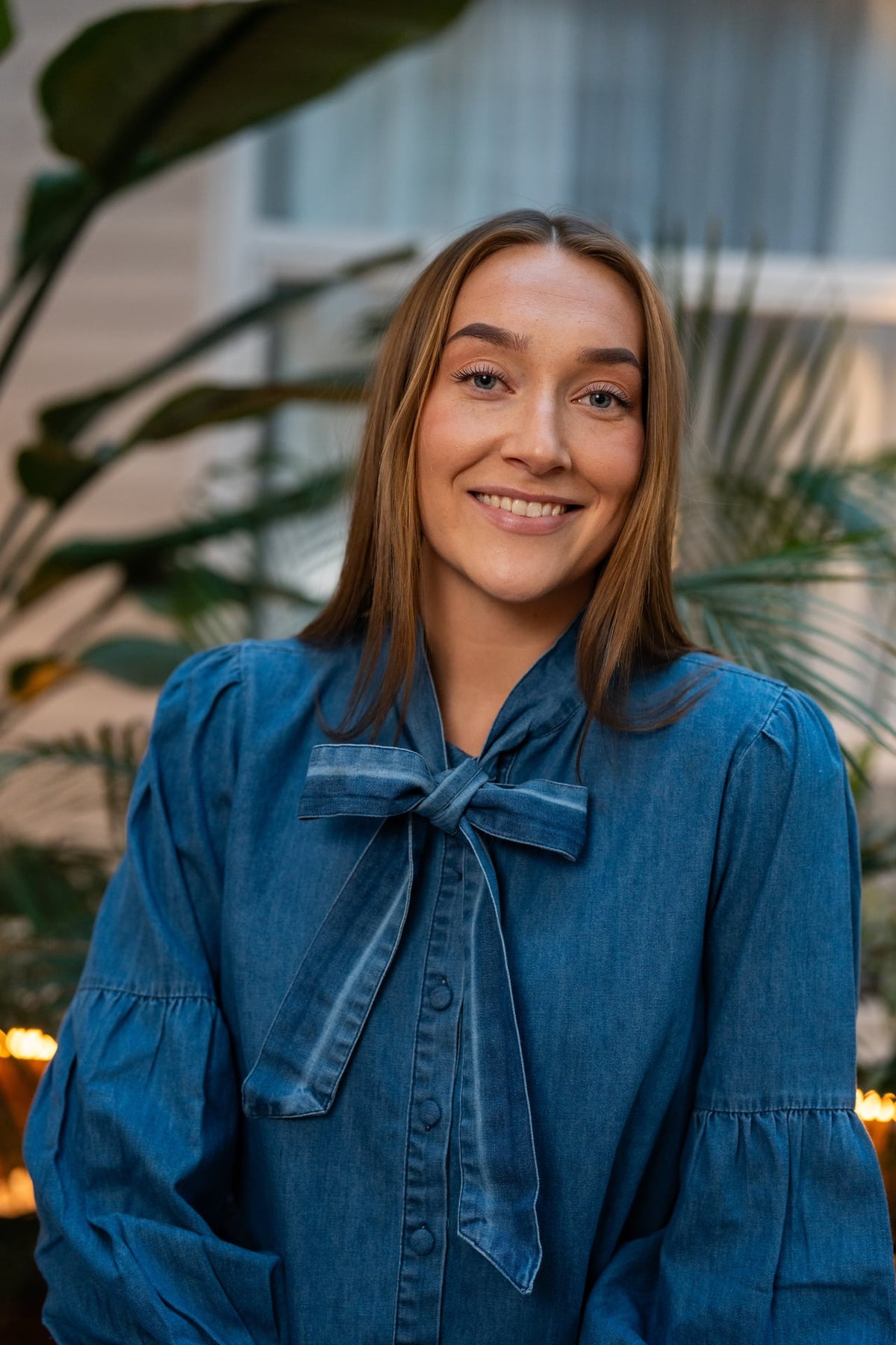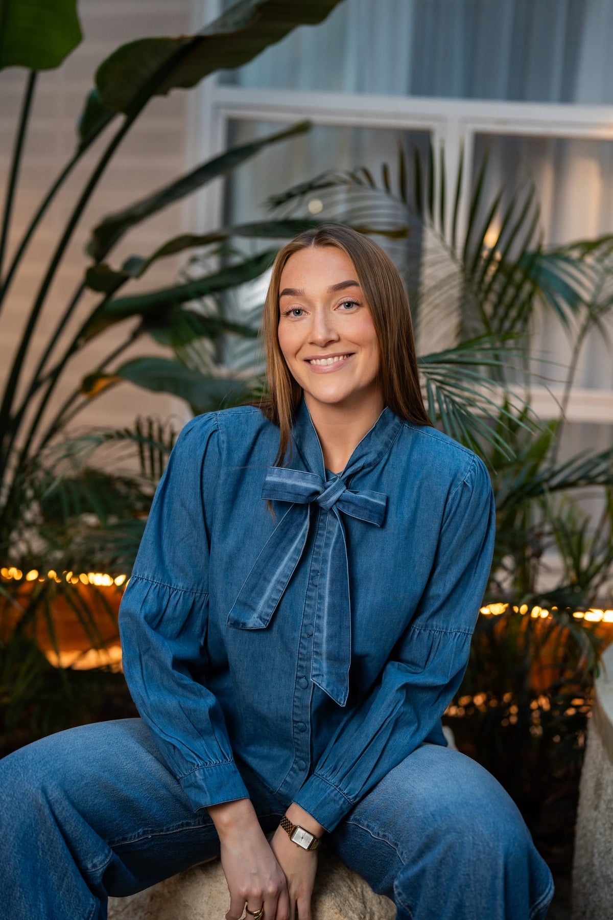 Superfin denimbluse fra norske RAH Oslo. Blusen har knepping hele veien ned og lange armer med sømdetalj. Påsydd bånd i kragen som kan kan knytes og styles på mange måter.