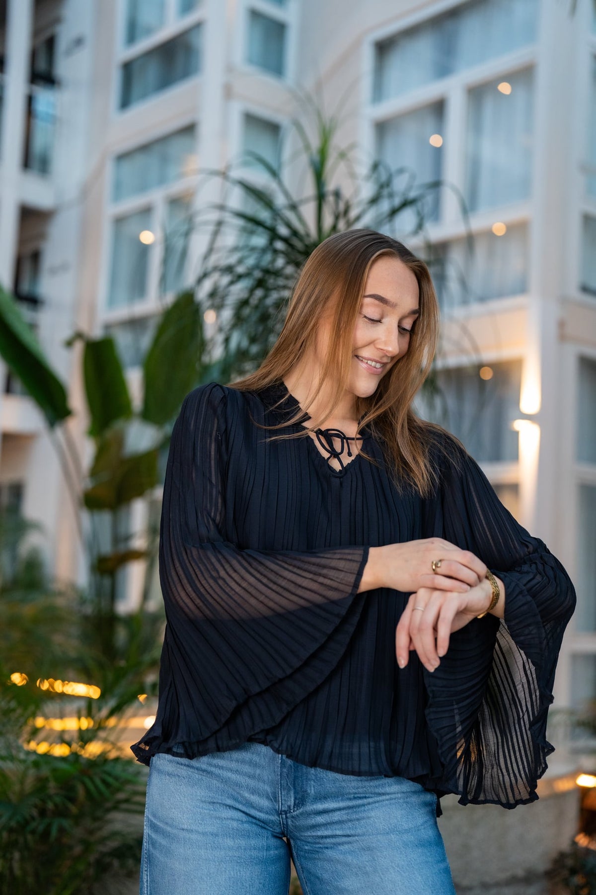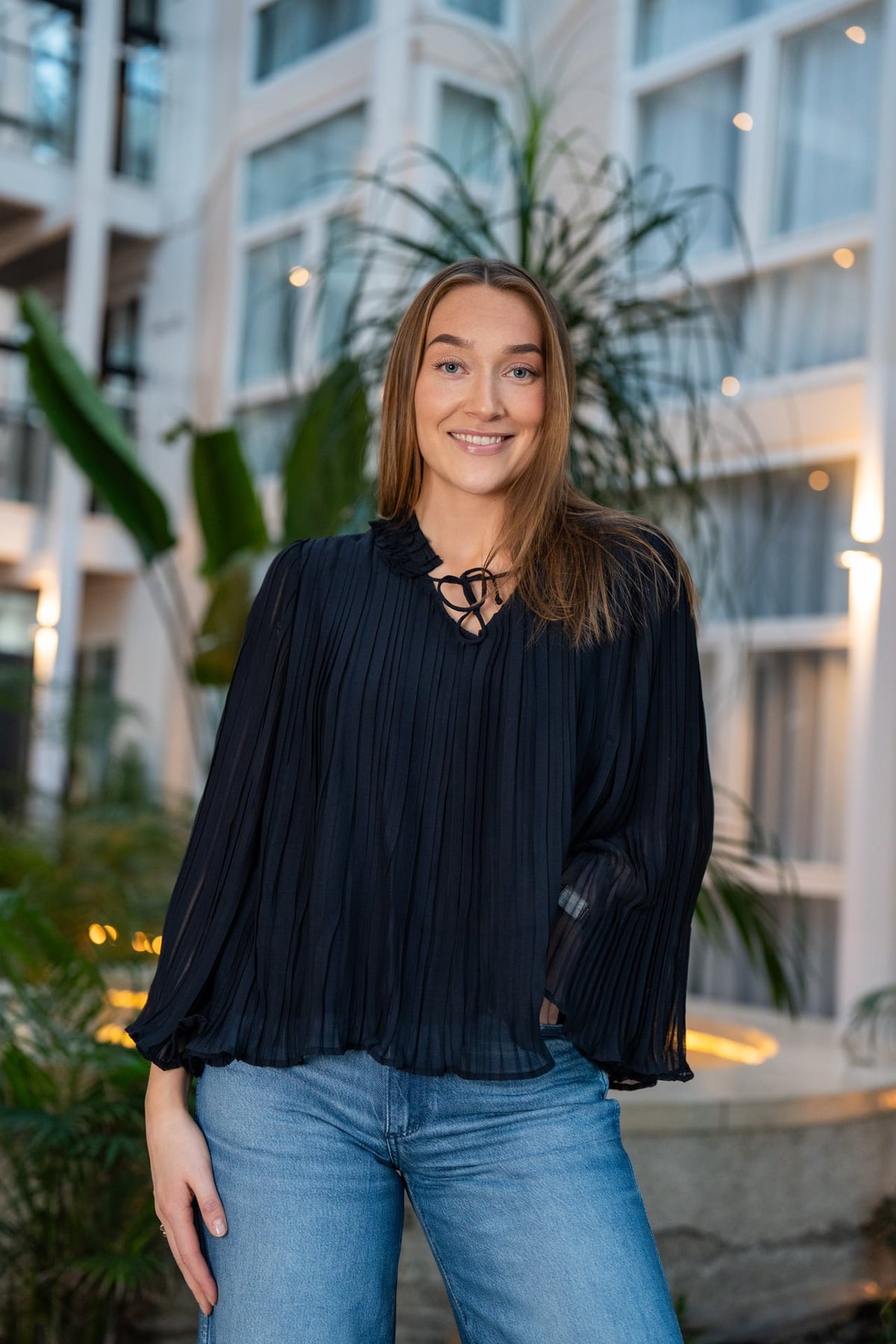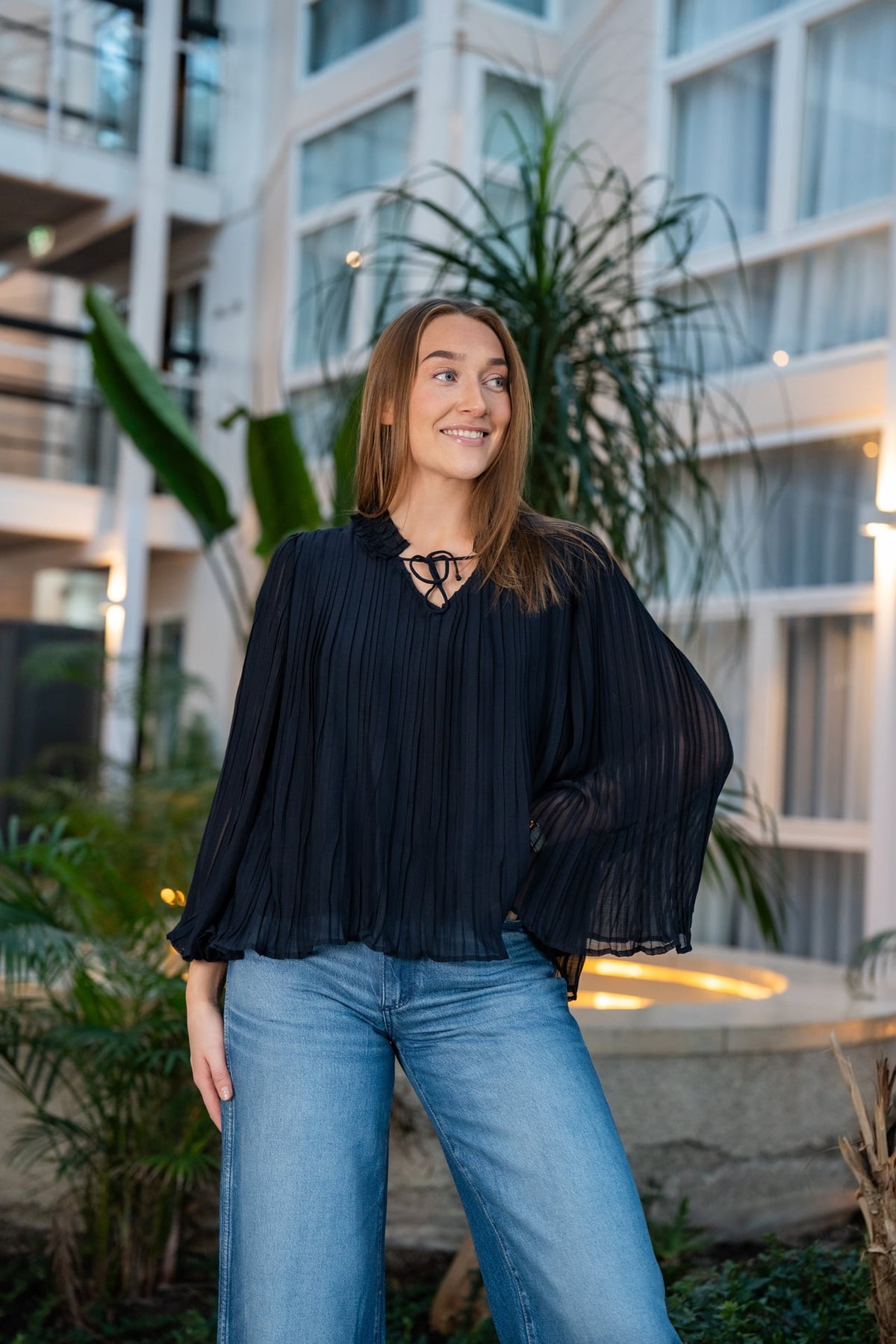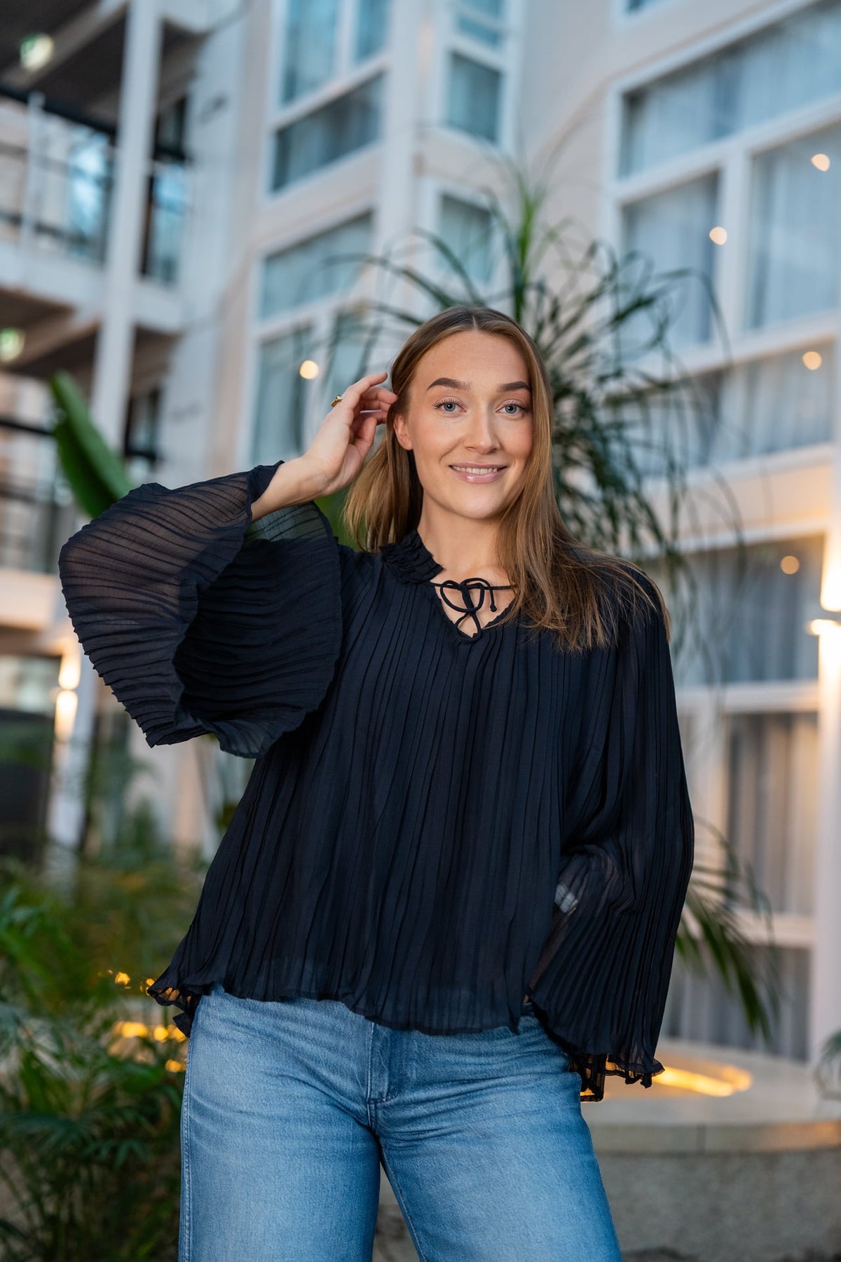 NuriSZ Blouse er en stilren og bærekraftig bluse laget av 100% resirkulert polyester. Hele blusen er i plissé, som gir en sofistikert, men avslappet utseende.