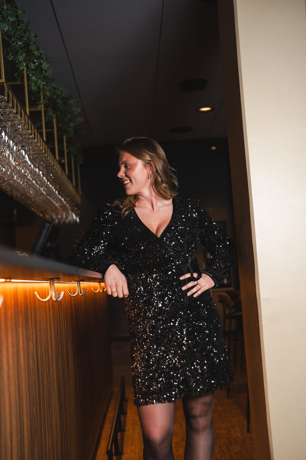 Kle deg ut i vår elegante YASELLE LS WRAP DRESS - SHOW, perfekt for å feire spesielle anledninger. Denne kjolen er laget av glitrende paljettstoff som gir en iøynefallende look, og har en flatterende V-hals og lange ermer.