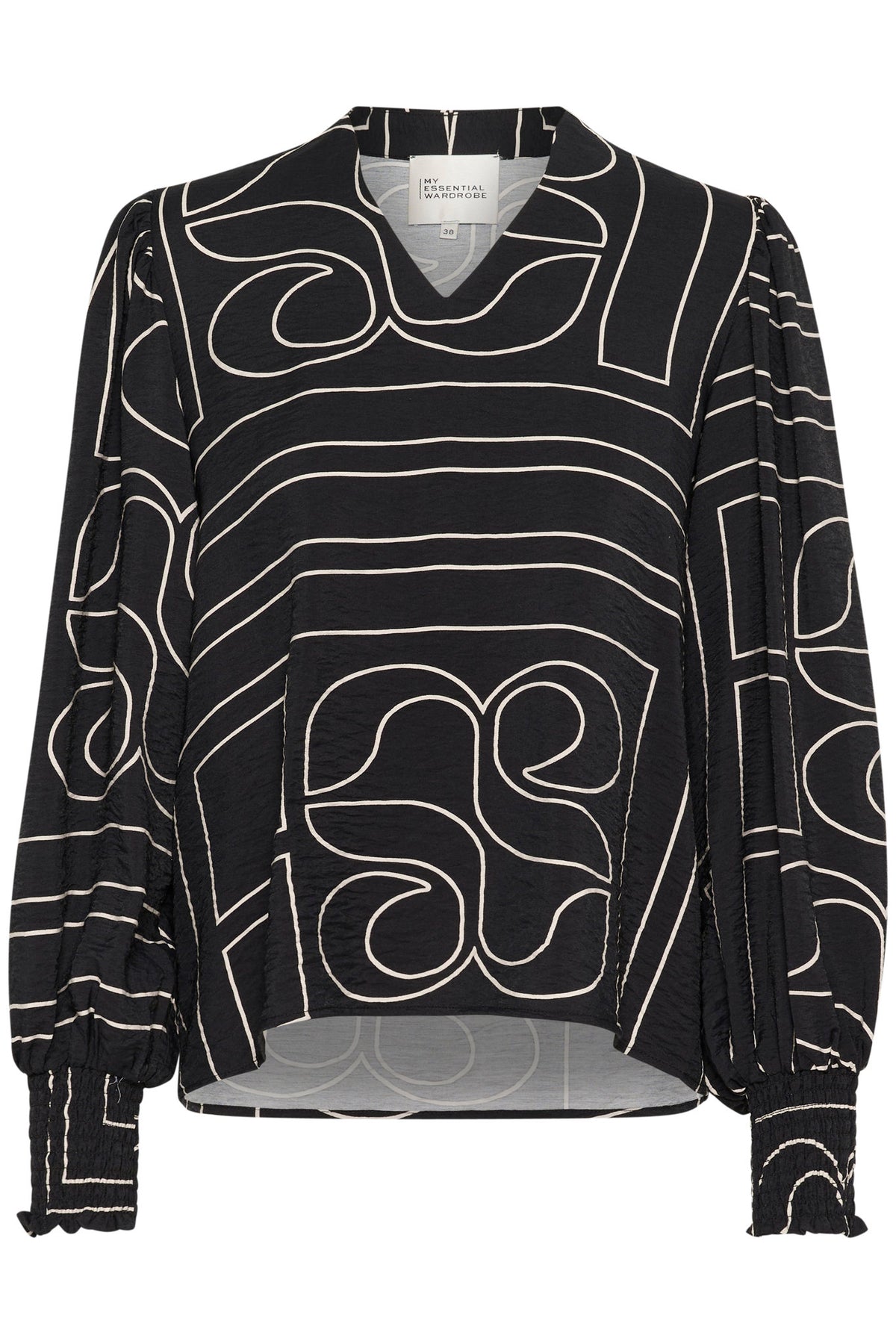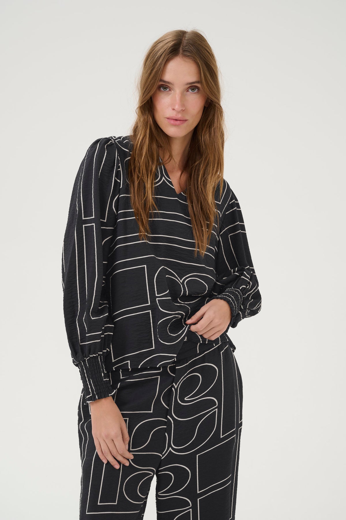 KellyMW Blouse i svart AOP kombinerer stil og komfort med sitt løse snitt og myke materialer. Denne blusen er perfekt for både hverdagsbruk og mer formelle anledninger.