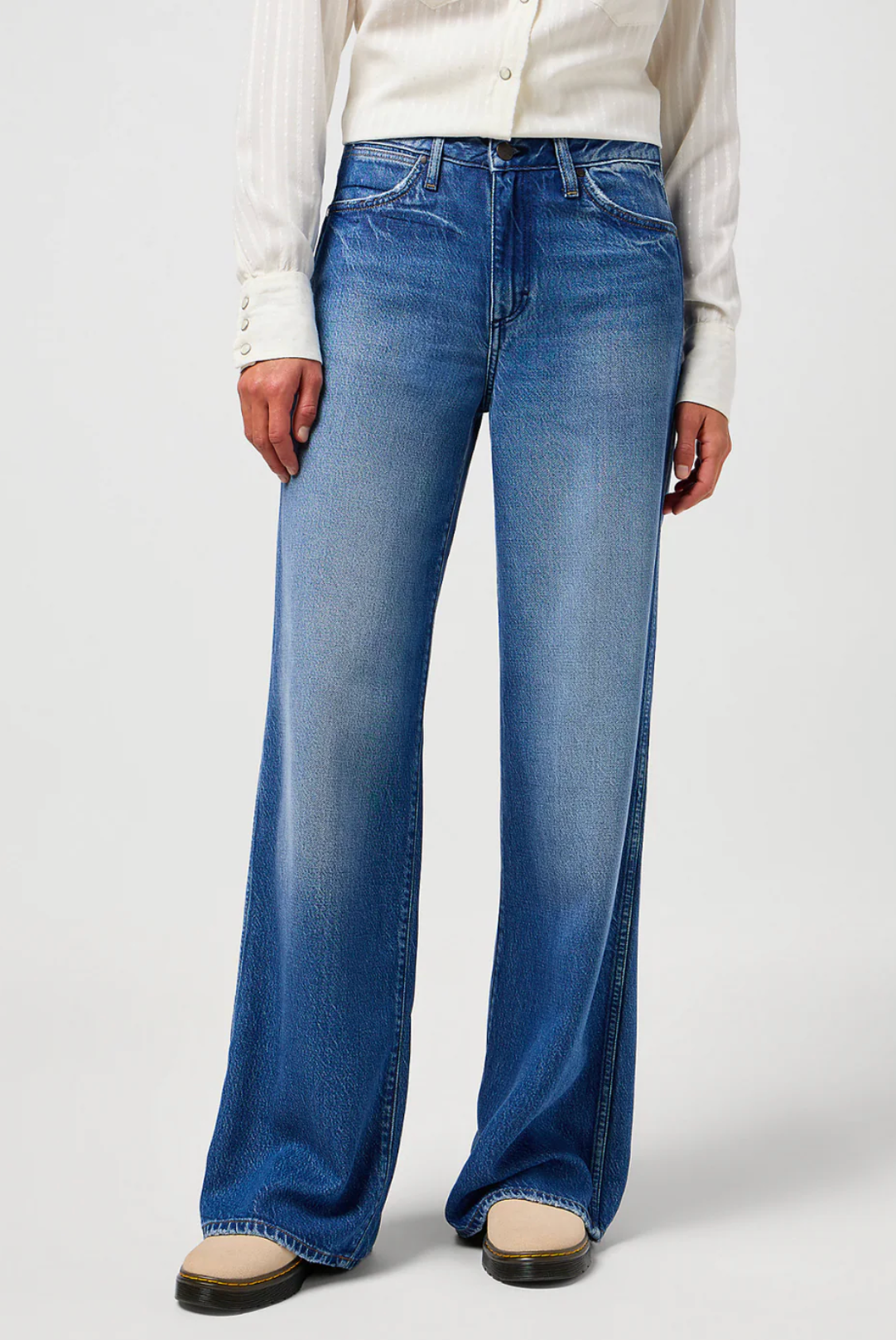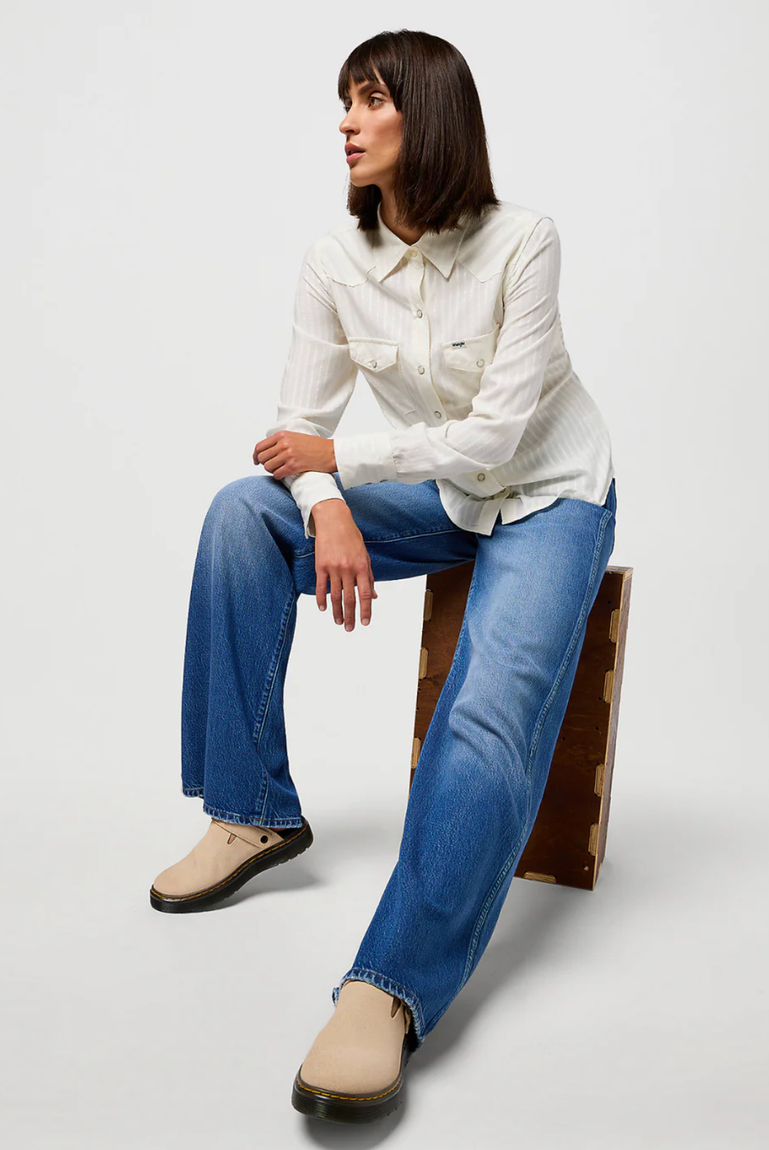 Klassiske Wrangler-detaljer inkluderer en glidelåsgylf med knappelukking, beltehemper og den ikoniske merkelappen på bakre linning.