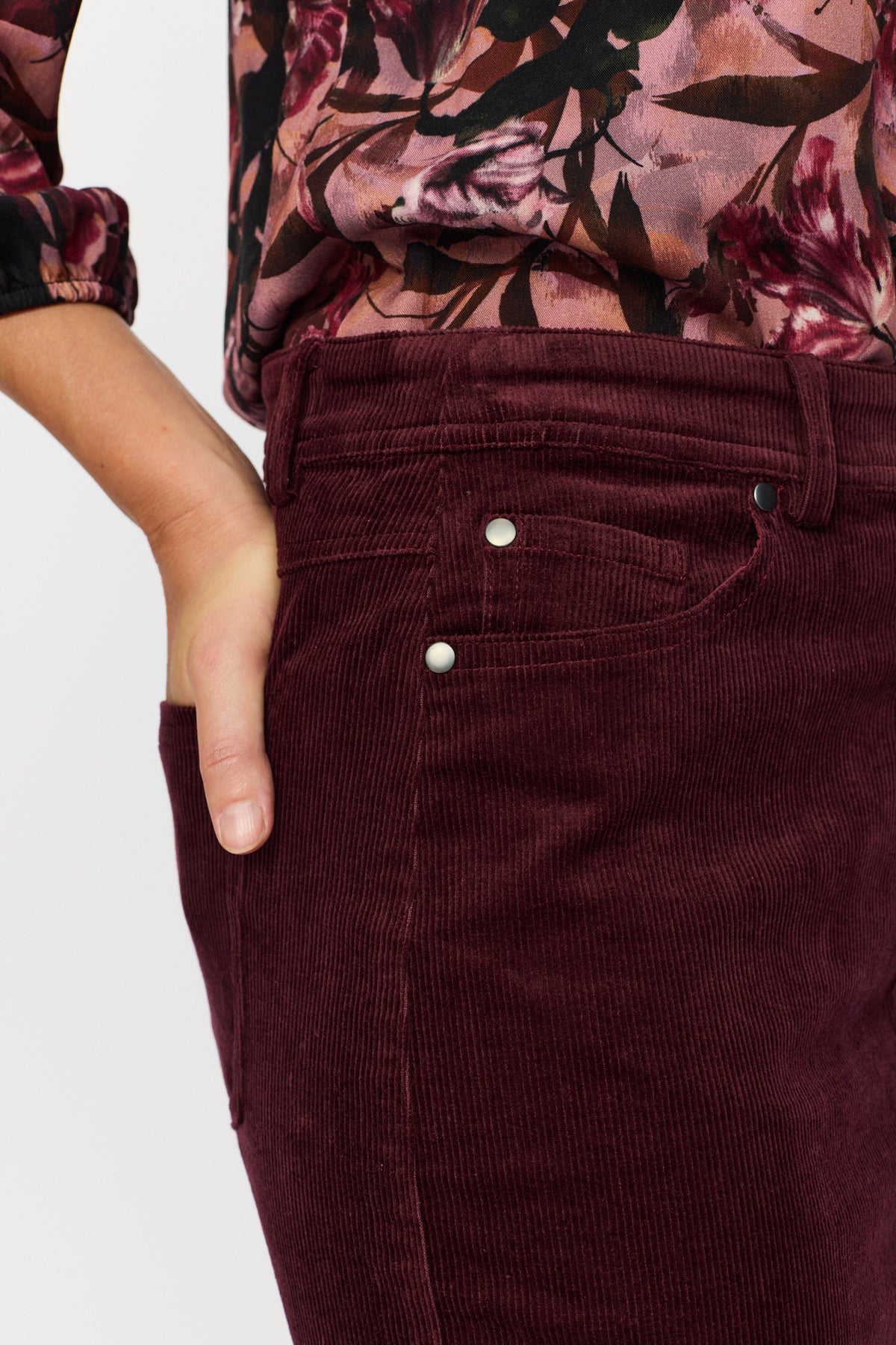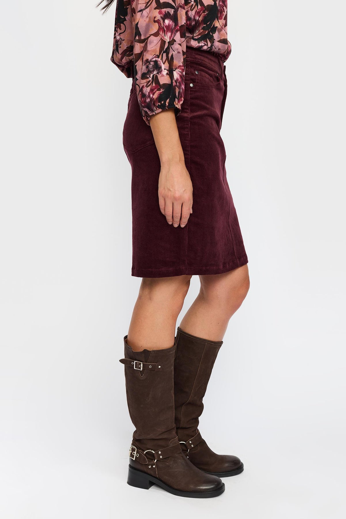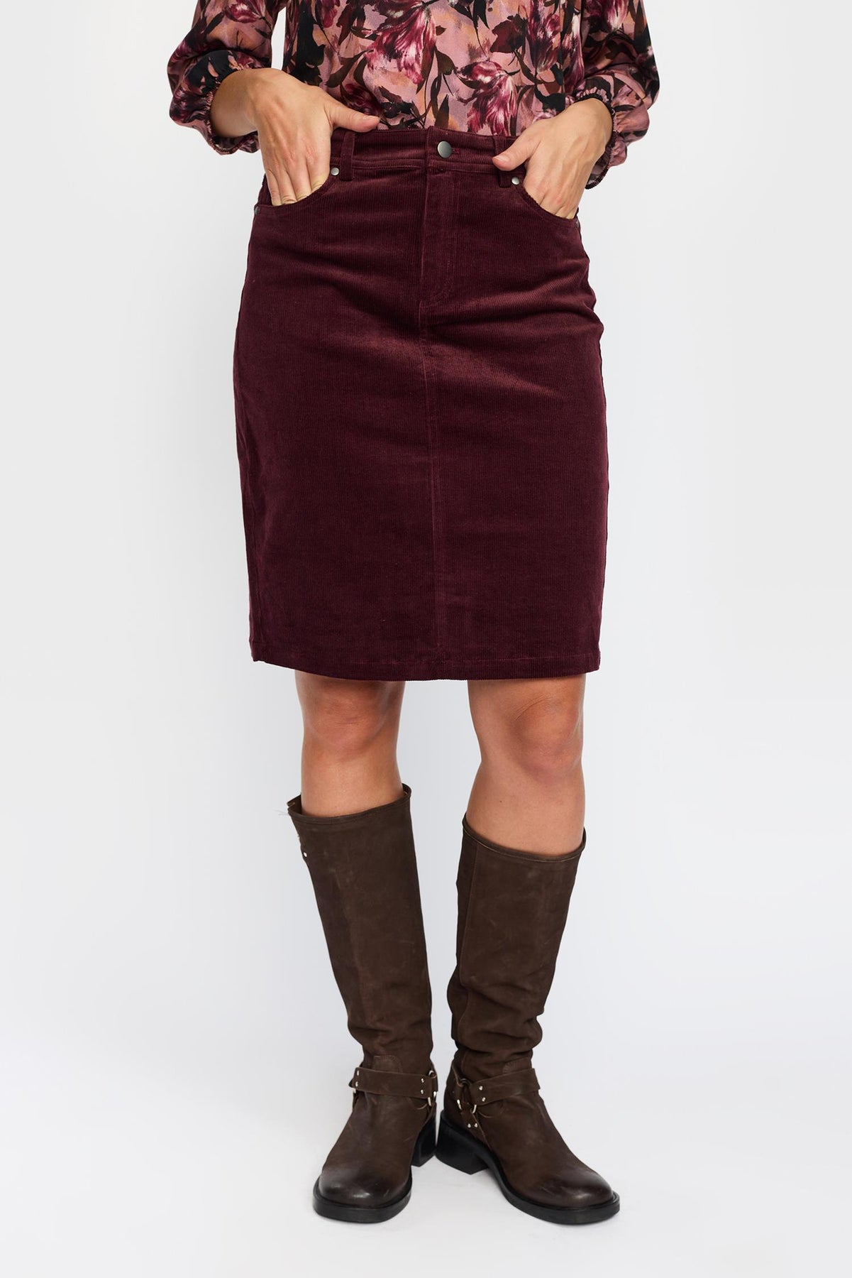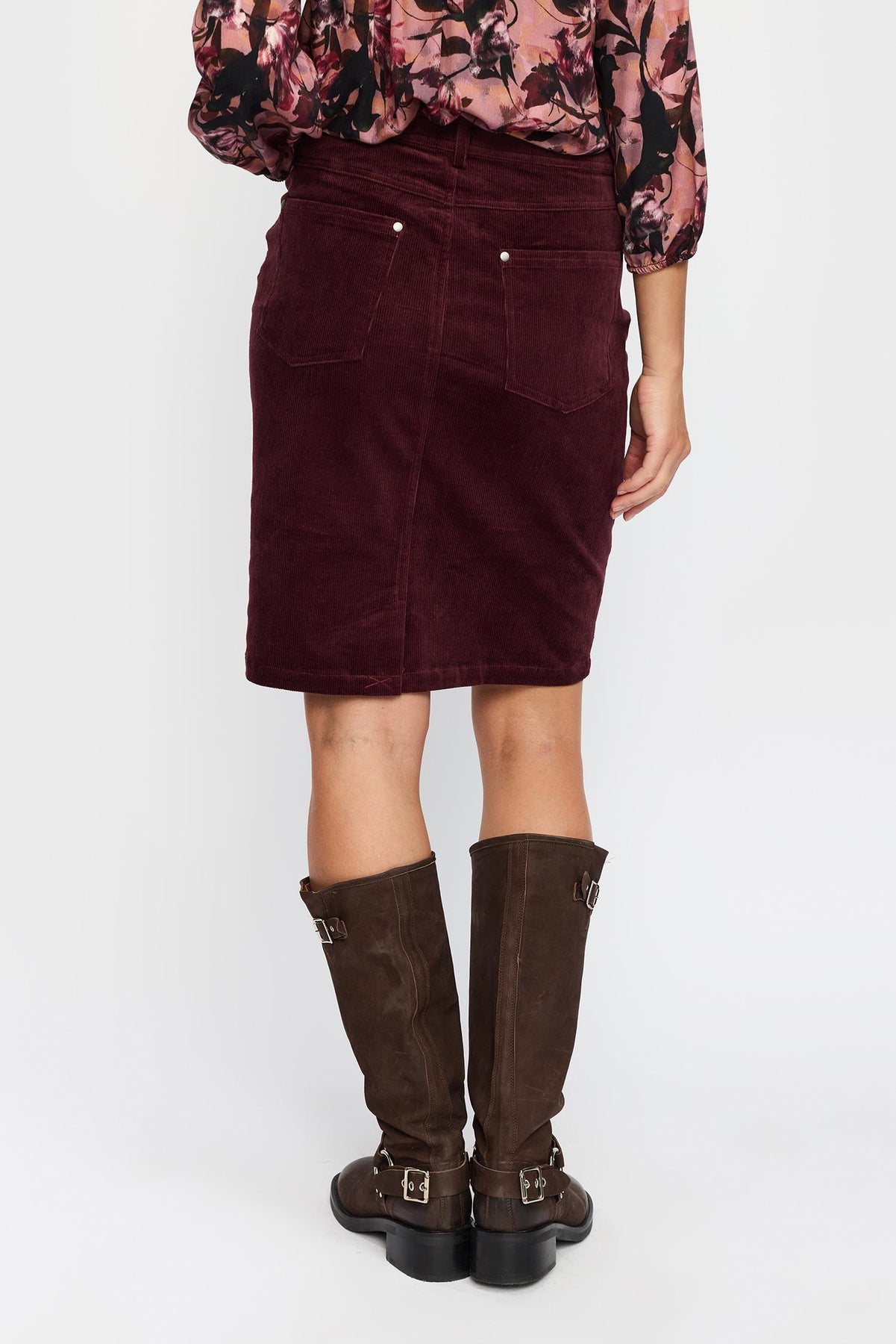 Mykt og enkelt cordskjørt fra 2-biz. Skjørtet har en fin knelende, lommer, beltehemper og lukking.