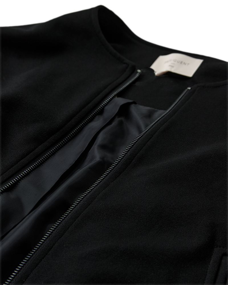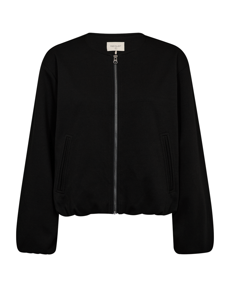 Stilig bomberjakke med strikk nede i kroppen og på ermene. Glidelås og lommer. Fôret på innsiden.