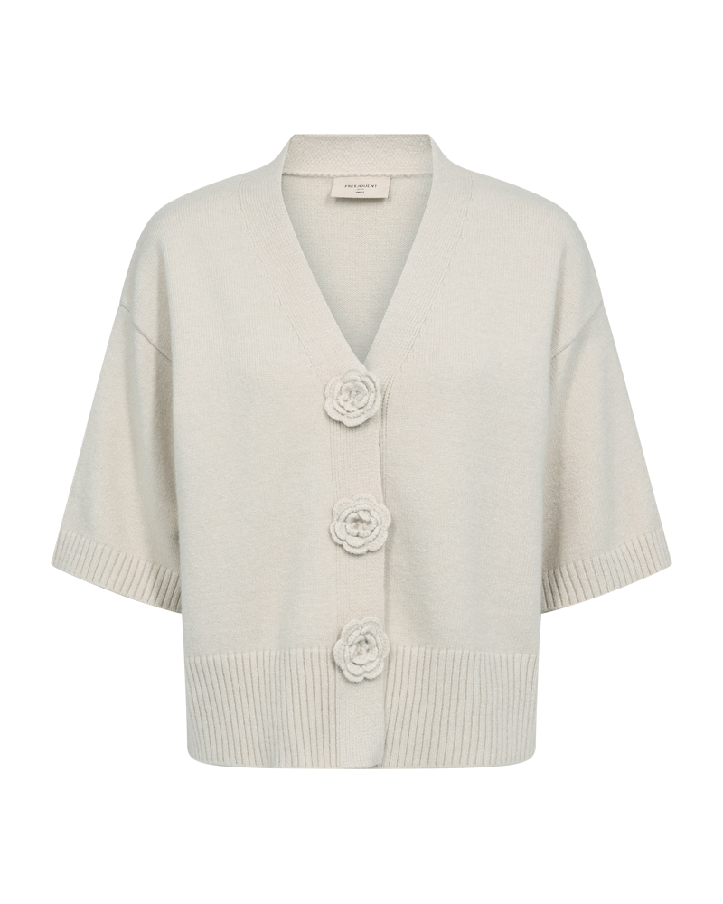 Myk og god cardigan fra Freequent. Superfine blomsterknapper, halv arm og v-hals.