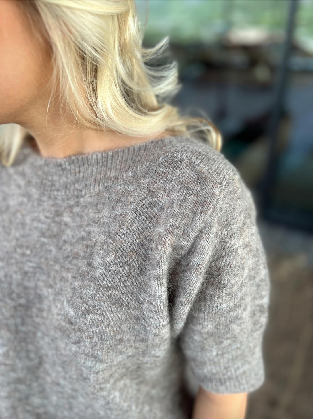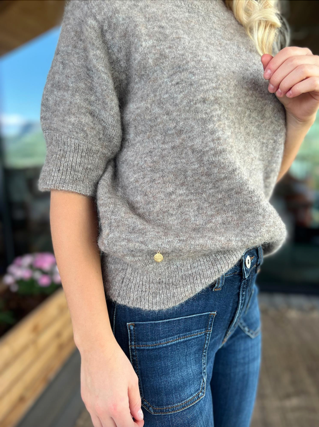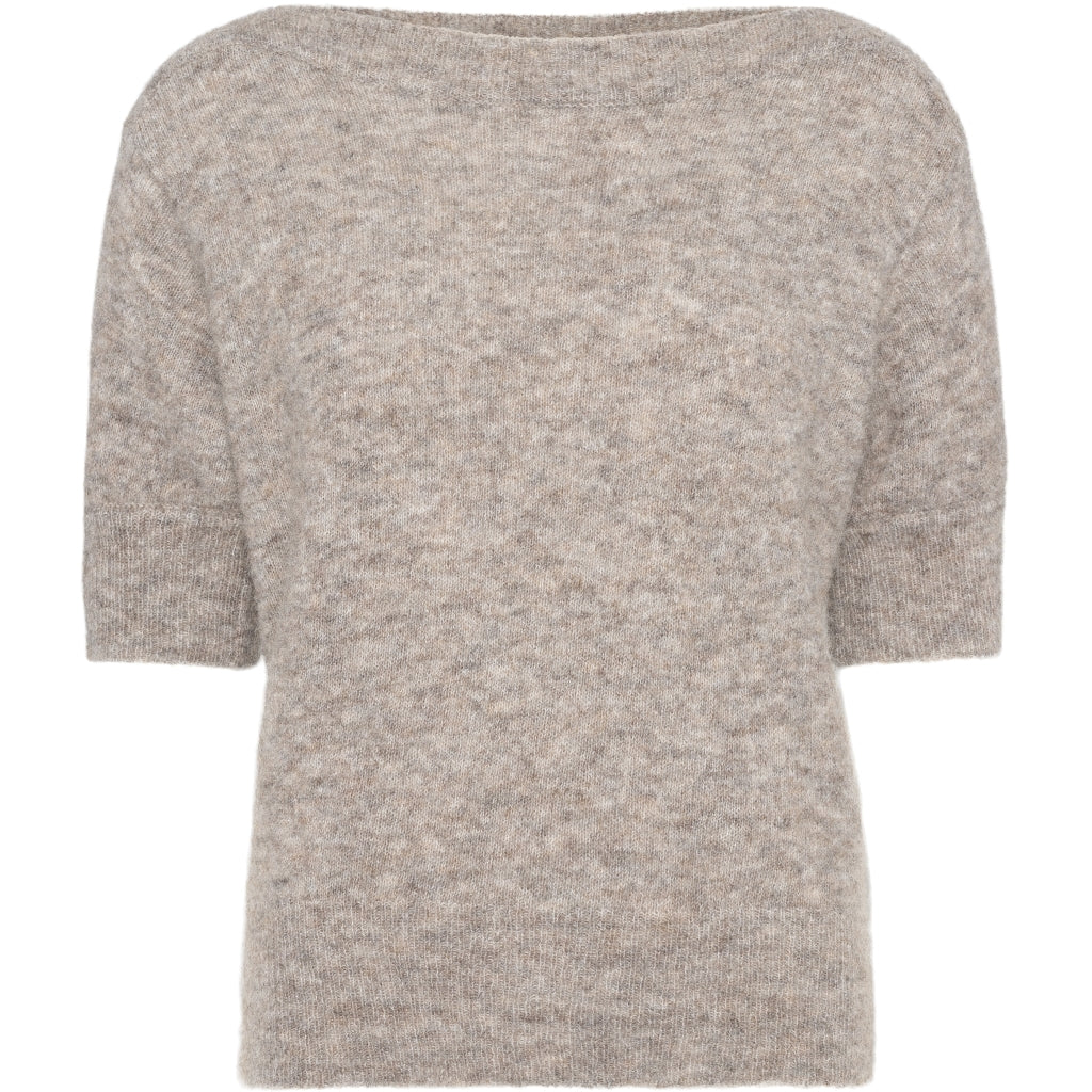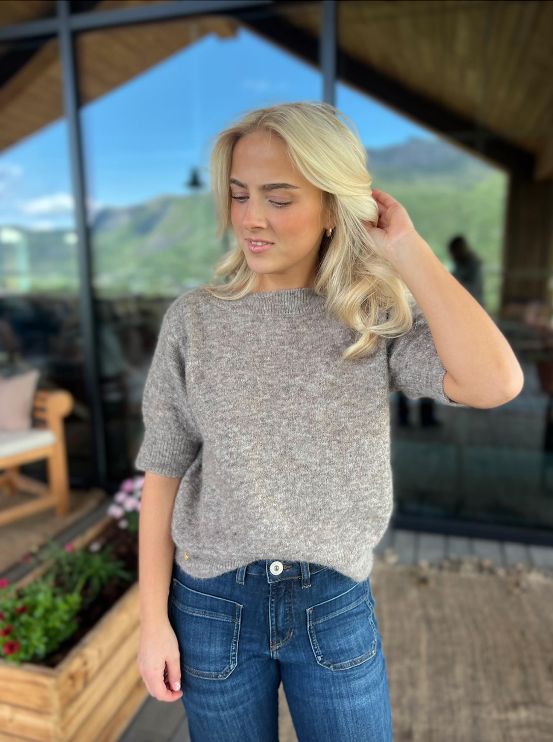 Kortermet genser med båthals i en nydelig brunmelert strikk.