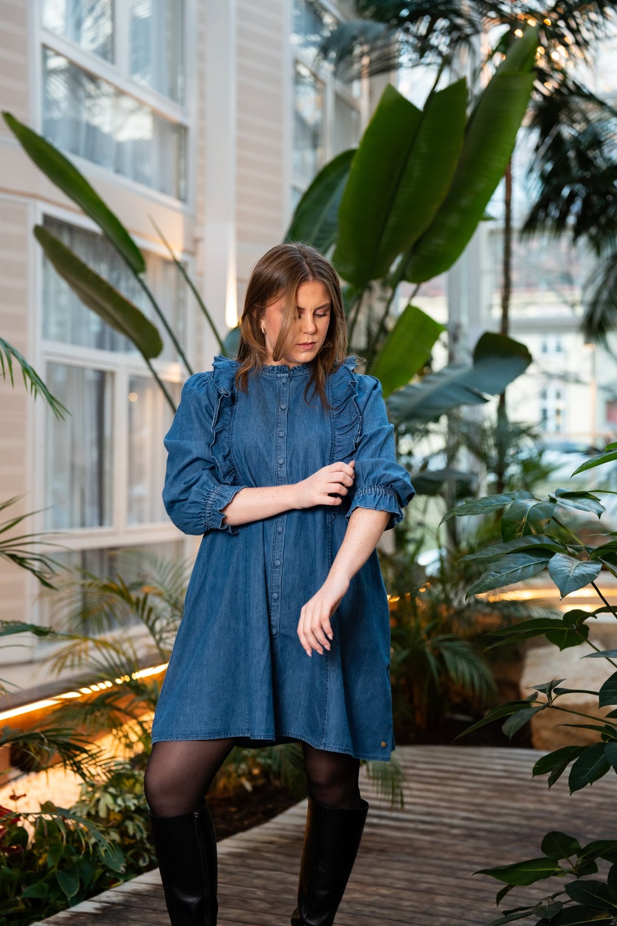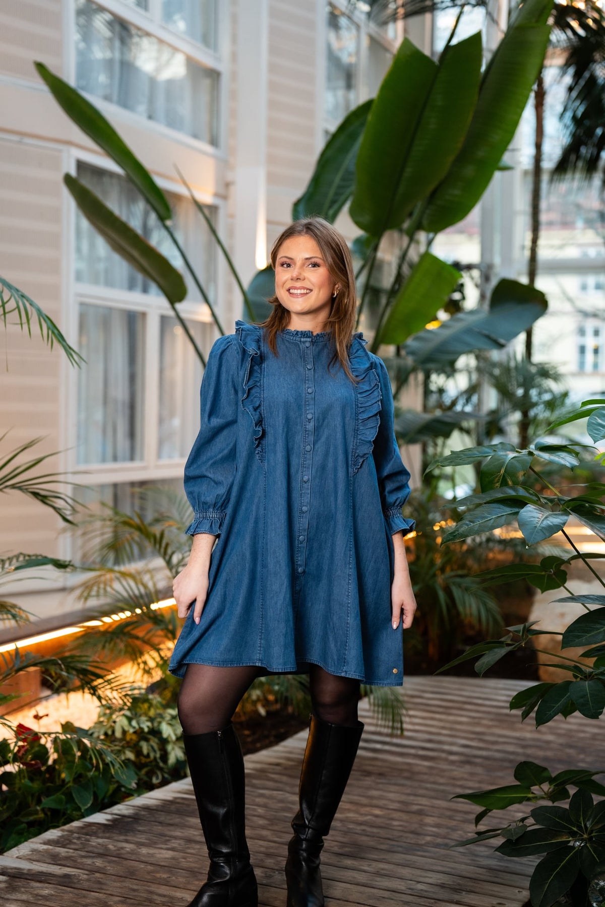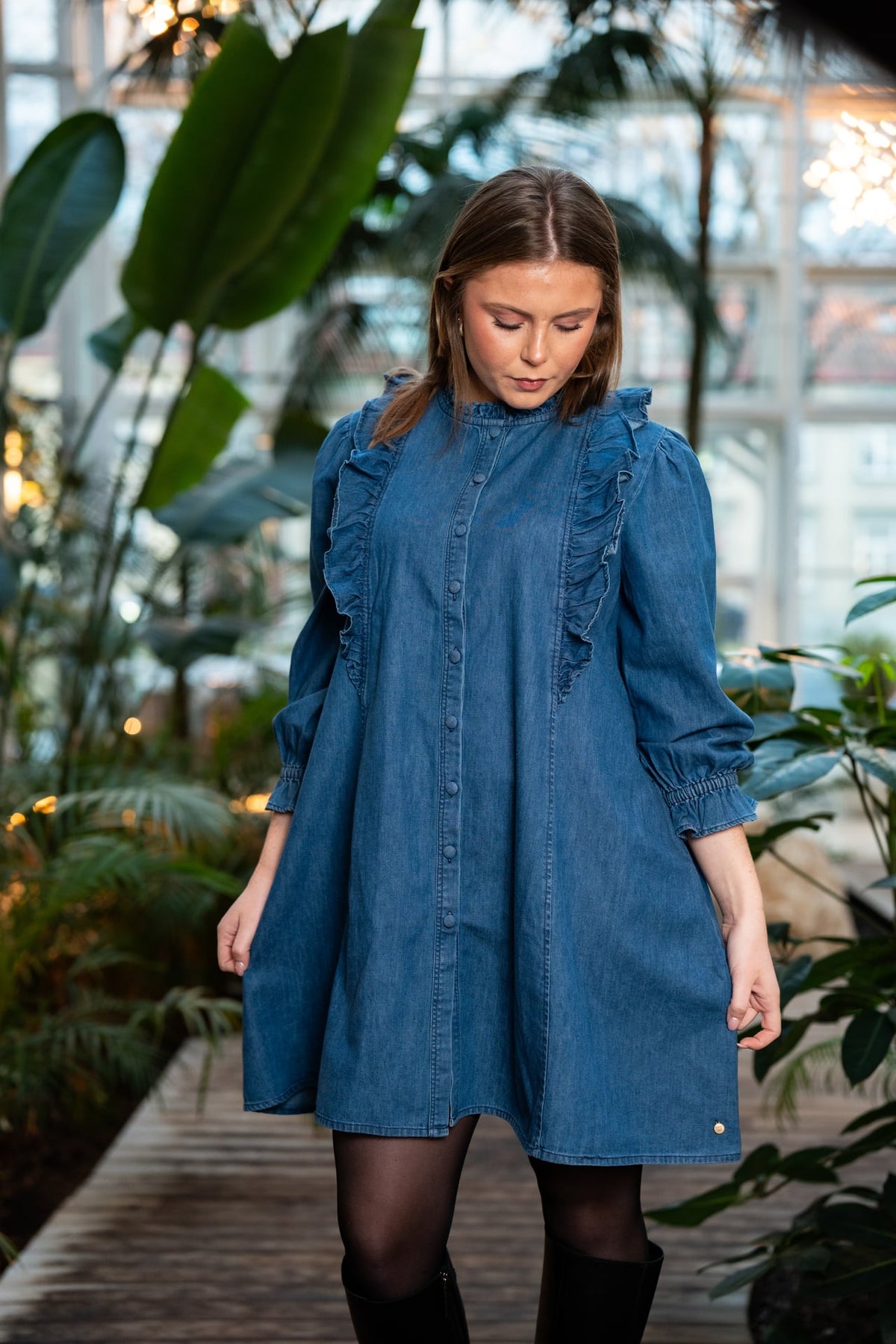 Feminin og fin denimkjole fra norske RAH Oslo. Kjolen har lommer, fine rysjedetaljer over skuldrene, og 3/4 arm med strikk på ermene.