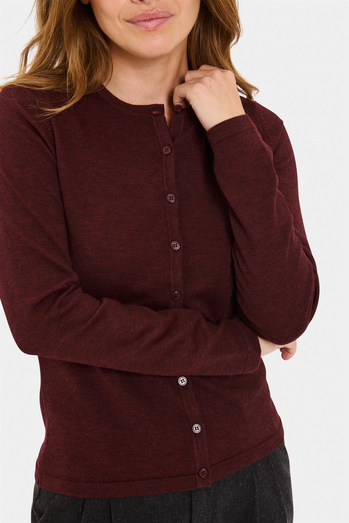 MilaSZ R-Neck Cardigan er en elegant og komfortabel strikkegenser i en vakker vinrød melangefarge. Laget av bærekraftig LENZING™ ECOVERO™ viskose, gir denne cardiganen både stil og mykhet, perfekt for hverdagsbruk.