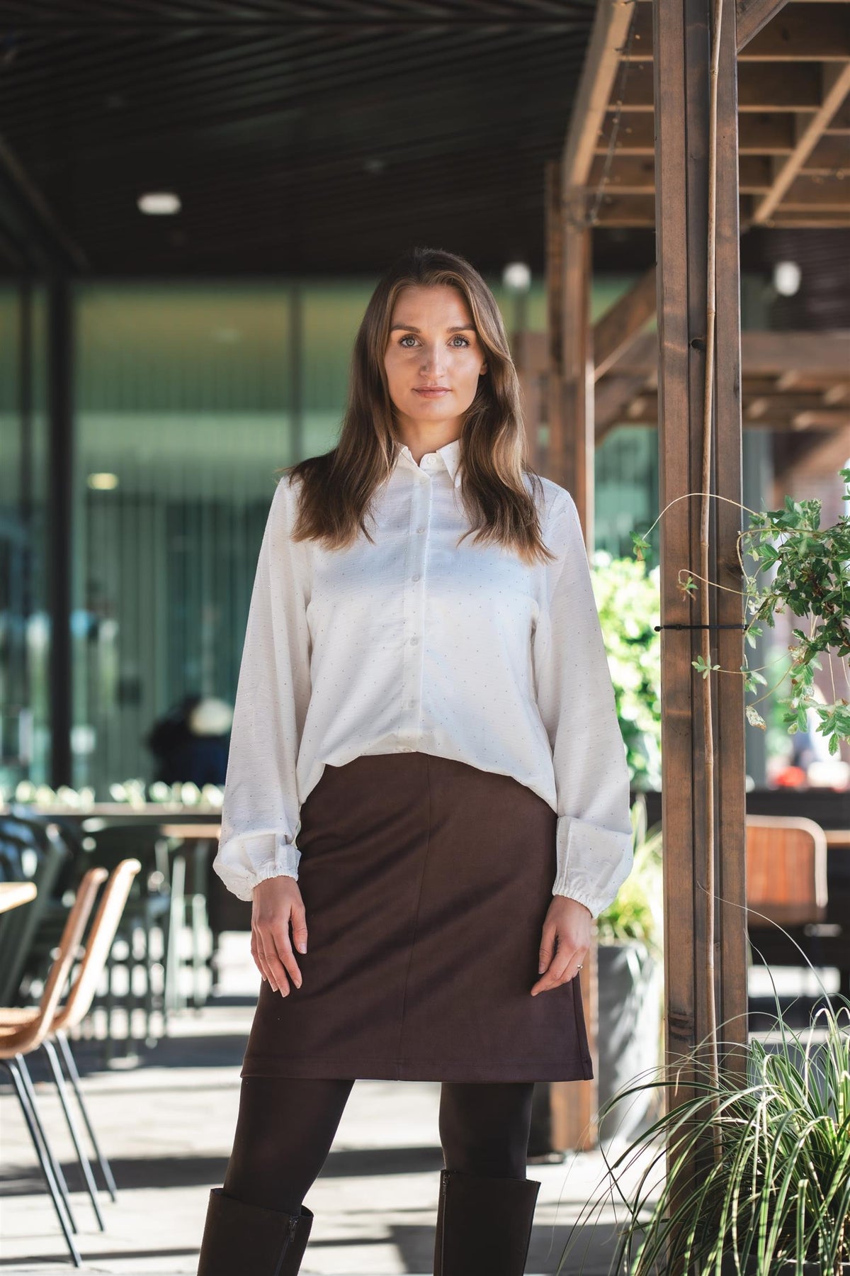 Stilig høstskjørt i semsket pu med stretch. Superfin å style til en lys bluse for en pyntet look, eller strikk og tykk strømpebukse for en deilig hverdagslook.
