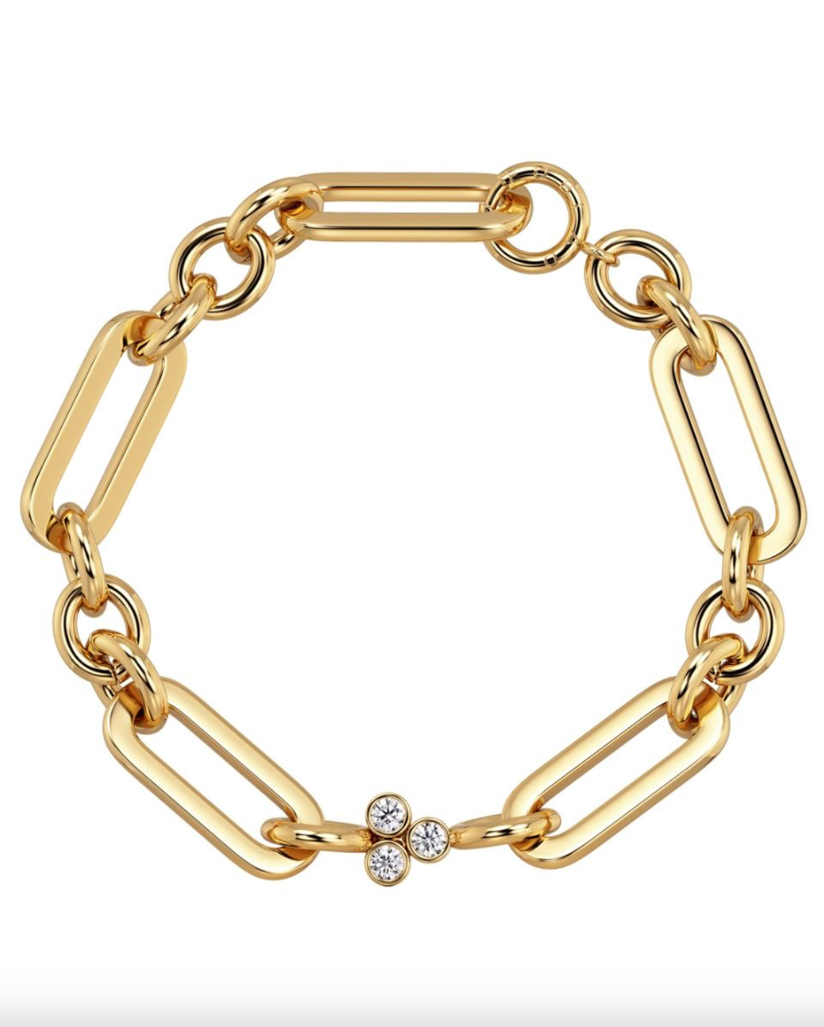Det stilige multiarmbåndet, her i 14K gullbelegg, blander lenker i forskjellige former, og prydes med den samme trioen av vakre små steiner som studsene og armbåndet.