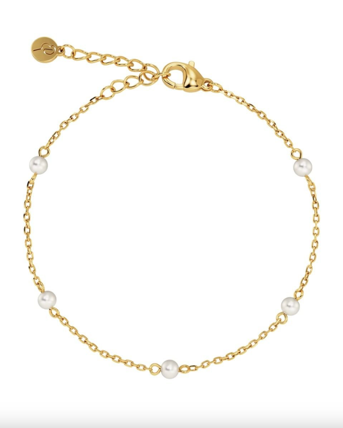 En rytmisk repetisjon av miniperler danner grunnlaget for denne romantiske og allsidige serien som passer like godt til fest som til hverdagsbruk. Det fine armbåndet, her i 14K gullbelegg, hviler vakkert rundt håndleddet.