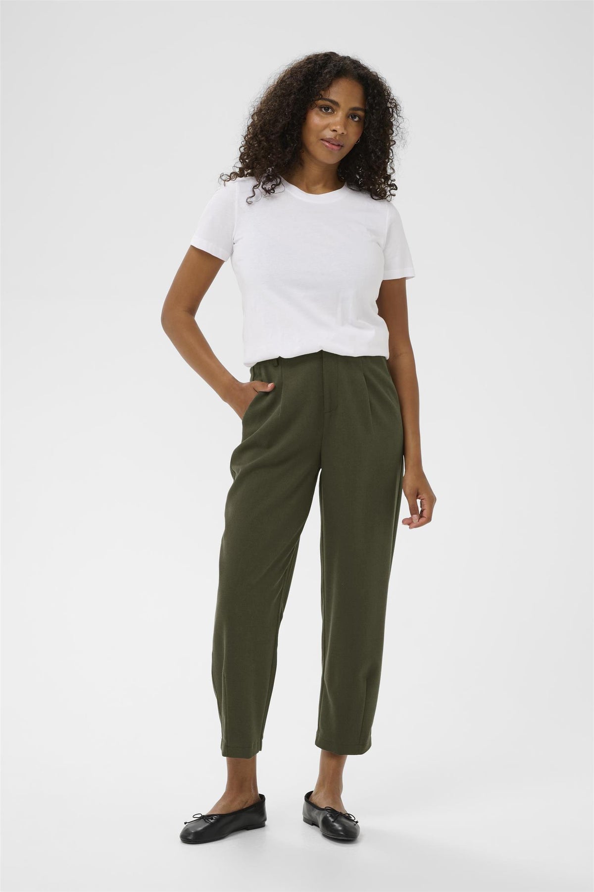 KAmerle Pants Cropped er et stilrent og komfortabelt valg for enhver garderobe. Med sin høye midje og ankel lengde, gir disse buksene en moderne silhuett som passer perfekt til både hverdagsbruk og mer formelle anledninger.