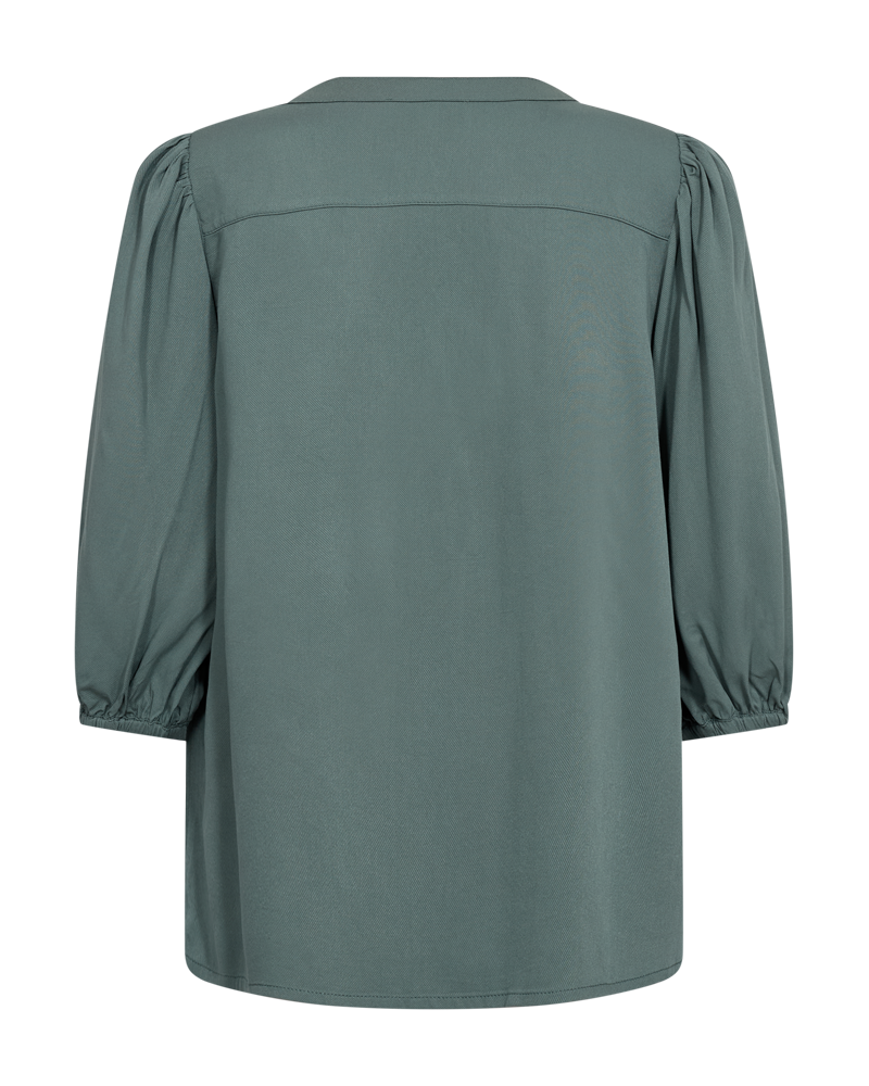 Enkel og stilren bluse fra Freequent. Avslappet fasong med v-hals og knepping, Armene er 3/4 lange med strikk på ermene.