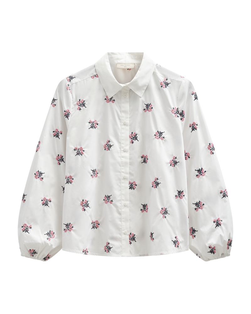 FQLEILA-BLOUSE er en stilren bluse som kombinerer komfort og eleganse. Den lyse off-white fargen med innslag av vill orkidé gir et friskt og feminint preg, perfekt for både hverdagsbruk og mer formelle anledninger.