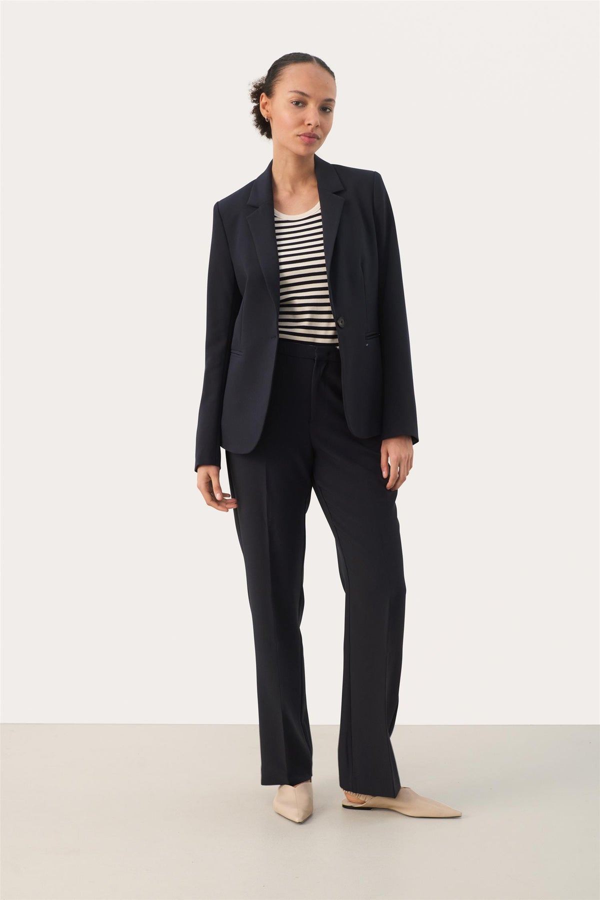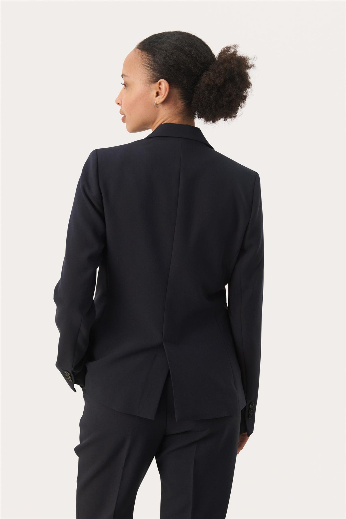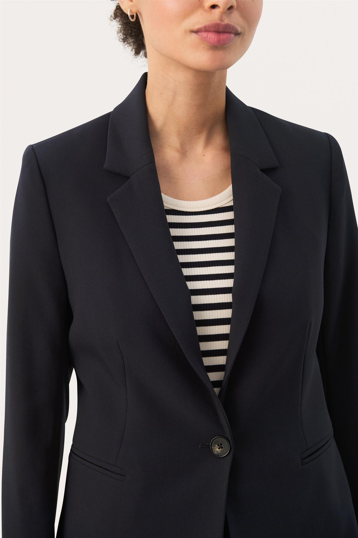 TaylorrPW BZ jakken i mørk marineblå er et stilrent valg for enhver anledning. Med en klassisk passform og en kombinasjon av resirkulert polyester og elastan, gir denne jakken både komfort og stil.
