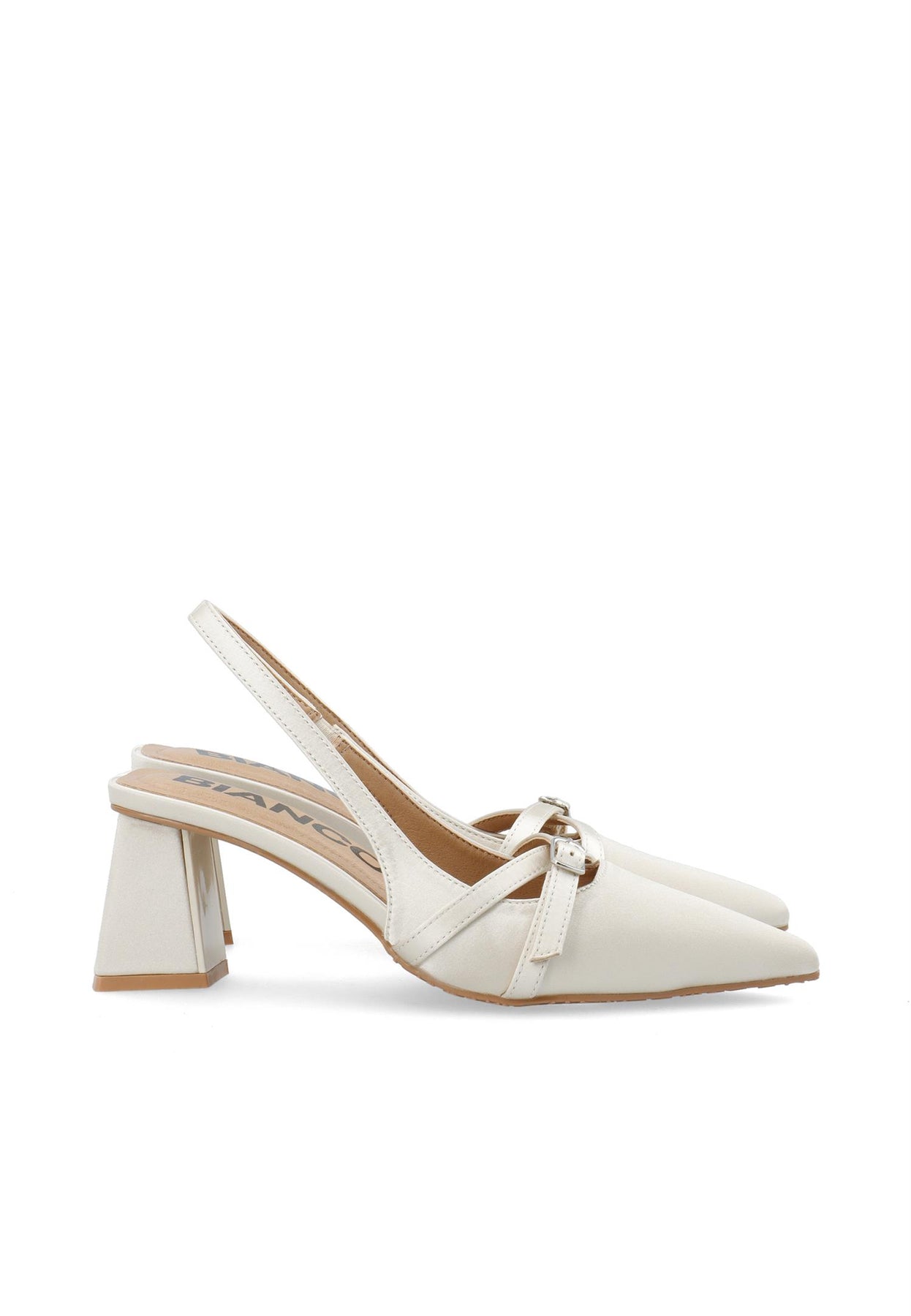 Biamaralyn er en kjent modell fra Bianco - nå i sateng med buckle-detaljer over fotflaten. Skoen har slingback med stretch, og blokkhel på 6cm.