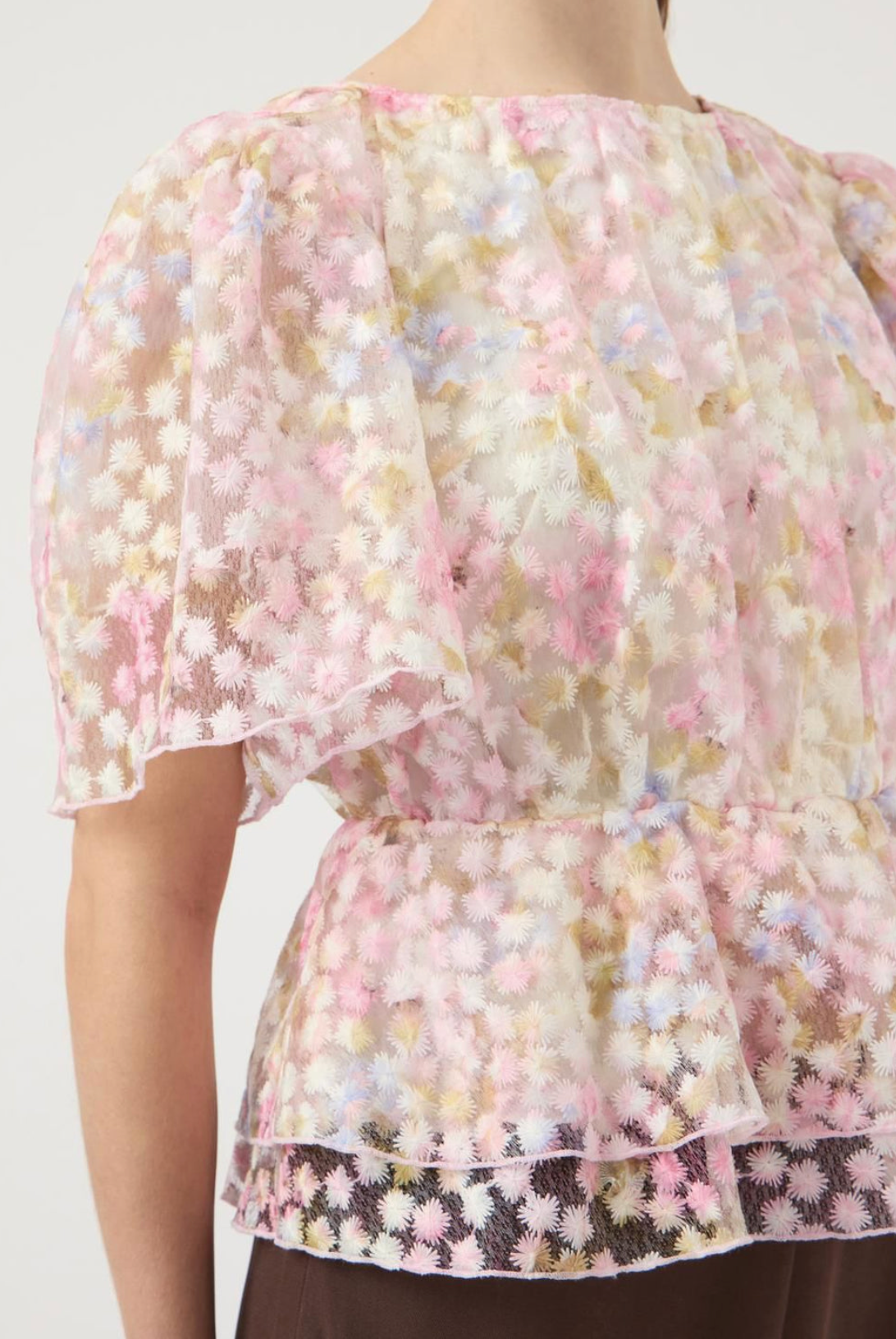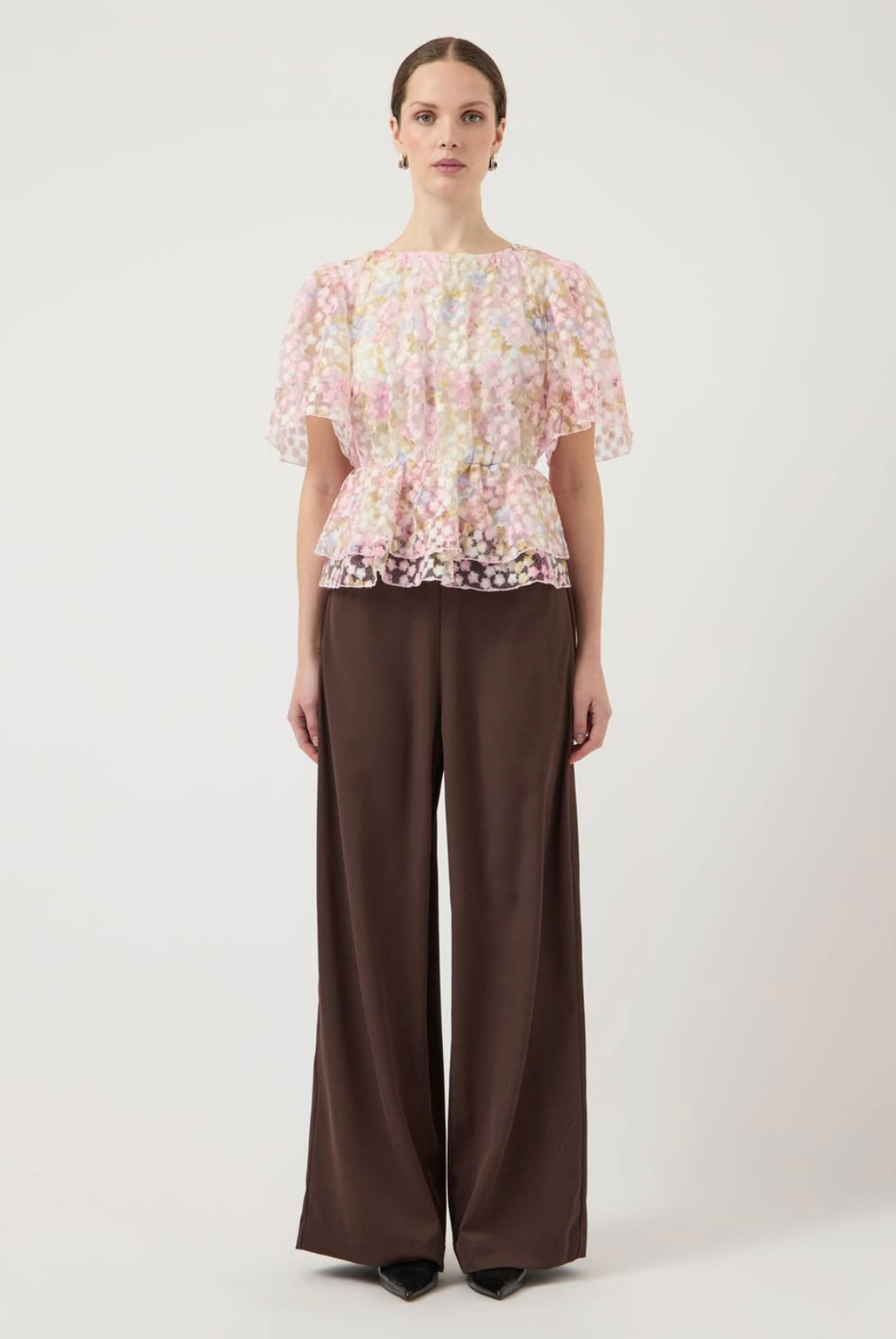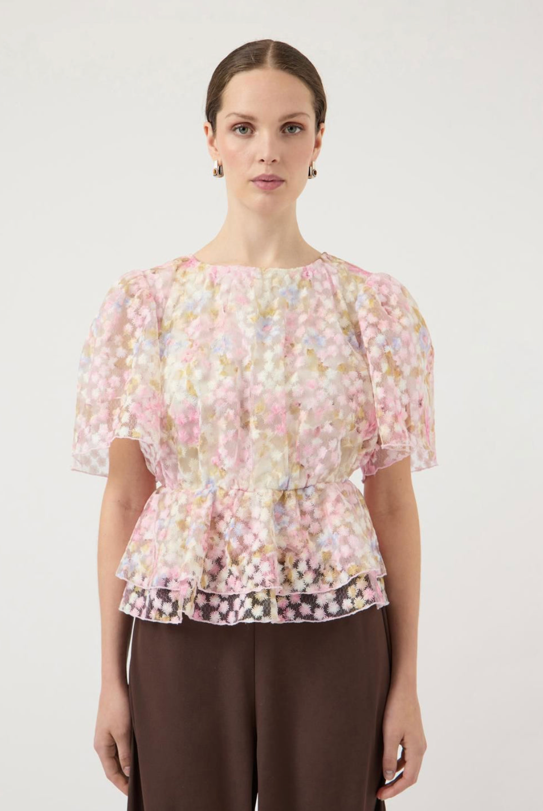 YASLEANNA SS TOP NEW S. - SHOW er en elegant og moderne topp laget av resirkulert polyester. Blusen har strikk i livet bak og en knapplukking i nakken.