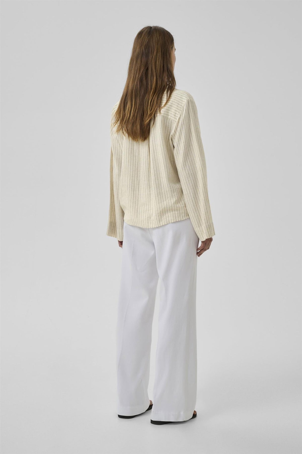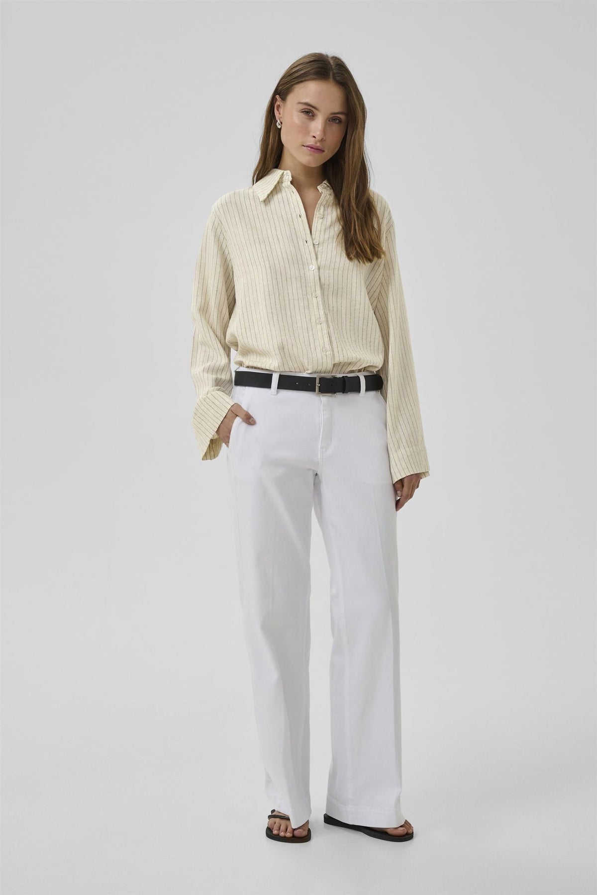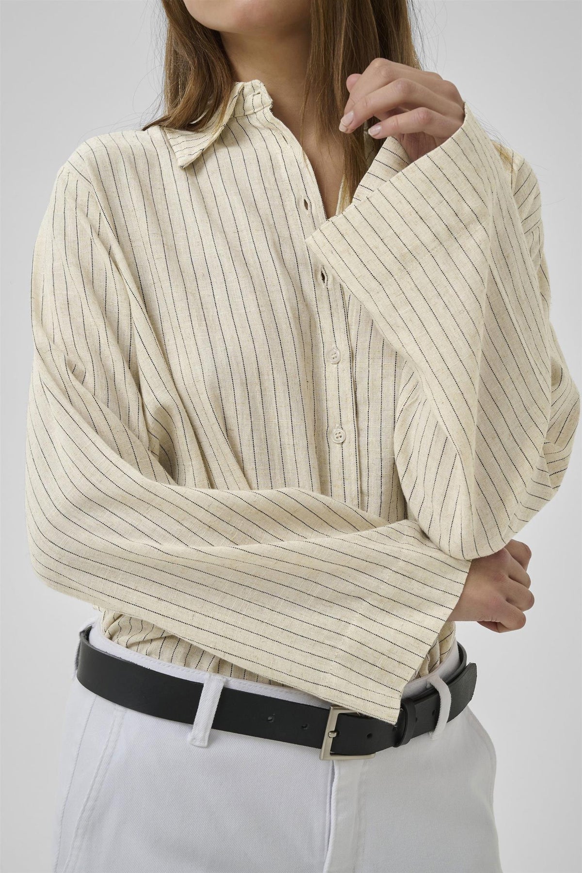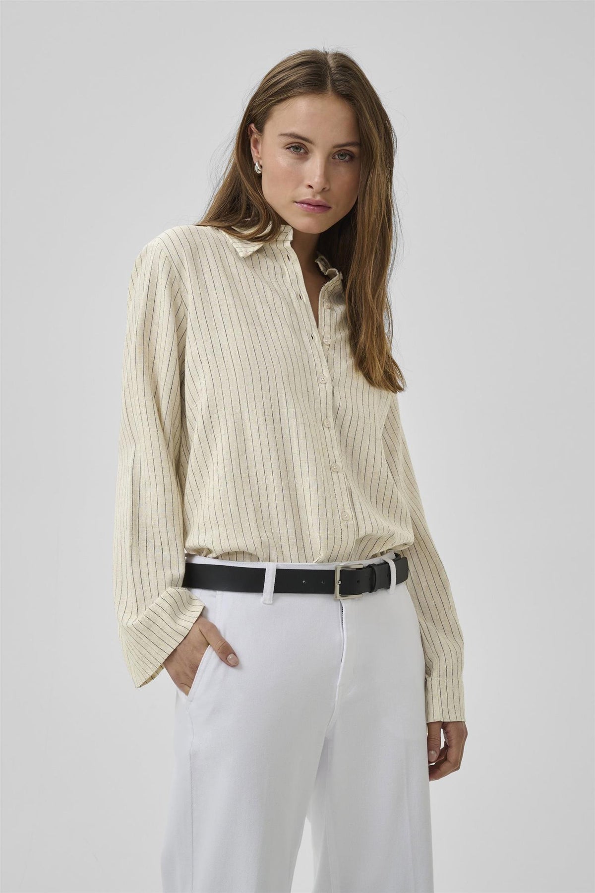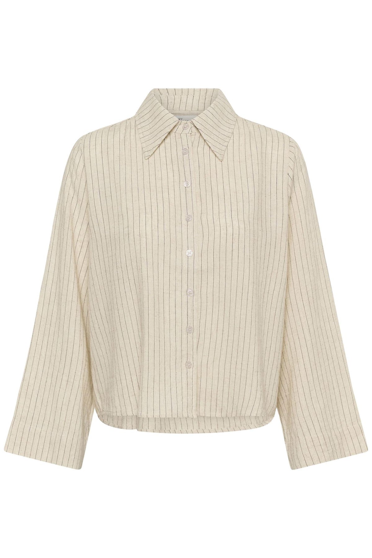 JannieMW Shirt i fargen Oatmeal med svarte striper er et stilrent valg for enhver anledning. Denne skjorten har en løs passform som gir både komfort og bevegelsesfrihet.