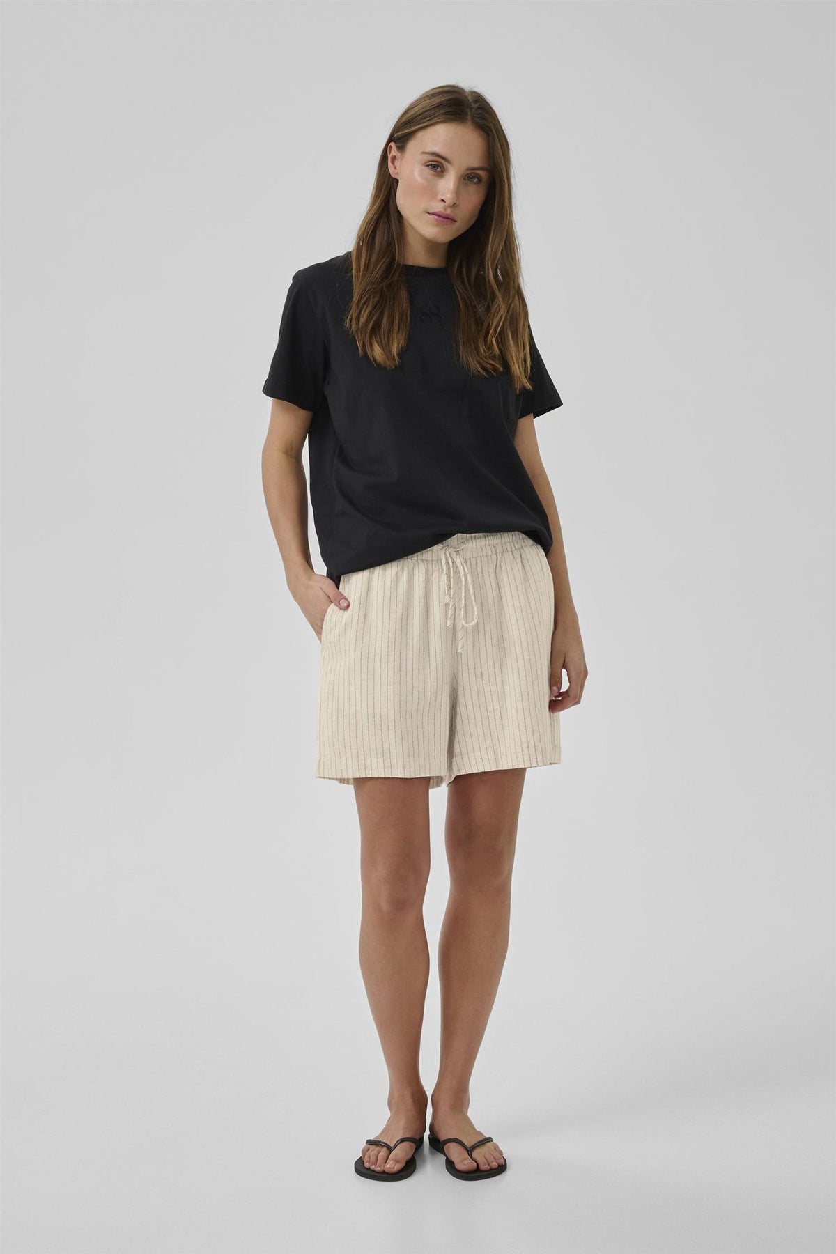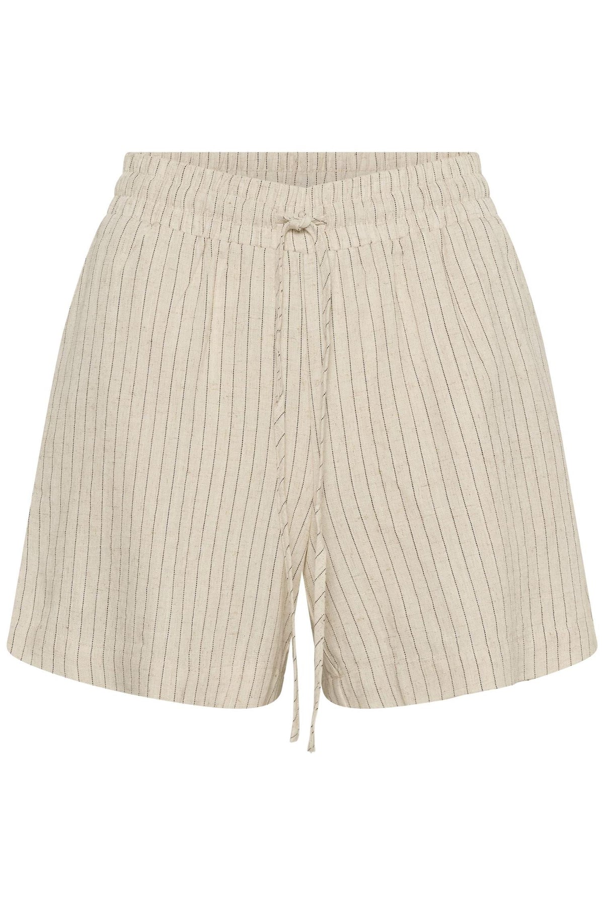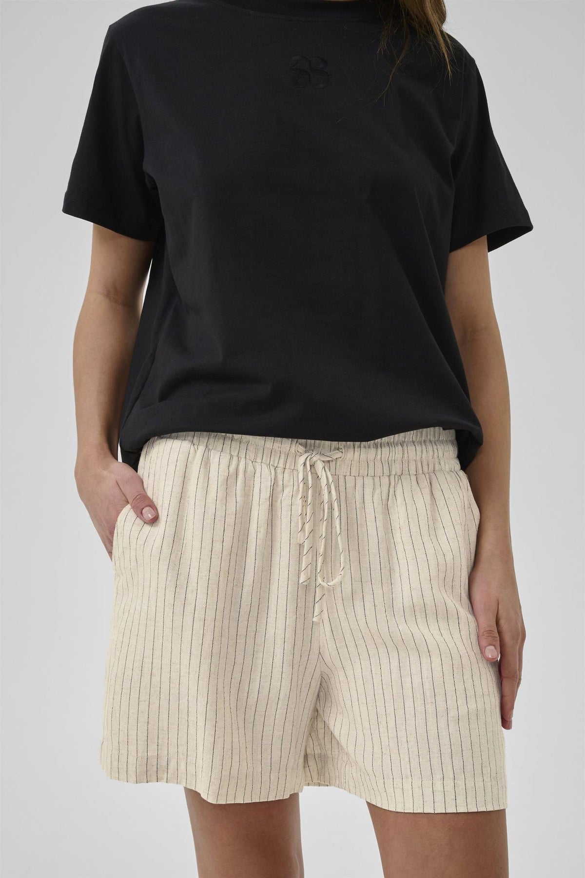 JannieMW Shorts i fargen Oatmeal med svarte striper er det perfekte valget for en avslappet stil. Med en komfortabel passform og elastisk midje, gir disse shortsene både stil og bevegelsesfrihet.